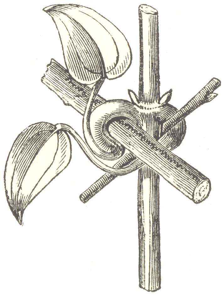 When a revolving shoot consists of several internodes, the lower ones bend together at the same rate, but one or two of the terminal ones bend at a slower rate; hence, though at times all the internodes are in the same direction, at other times the shoot is rendered slightly serpentine. The rate of revolution of the whole shoot, if judged by the movement of the extreme tip, is thus at times accelerated or retarded. One other point must be noticed. Authors have observed that the end of the shoot in many twining plants is completely hooked; this is very general, for instance, with the Asclepiadaceæ. The hooked tip, in all the cases observed by me, viz. in Ceropegia, Sphærostemma, Clerodendron, Wistaria, Stephania, Akebia, and Siphomeris, has exactly the same kind of movement as the other internodes; for a line painted on the convex surface first becomes lateral and then concave; but, owing to the youth of these terminal internodes, the reversal of the hook is a slower process than that of the revolving movement. [14] This strongly marked tendency in the young, terminal and flexible internodes, to bend in a greater degree or more abruptly than the other internodes, is of service to the plant; for not only does the hook thus formed sometimes serve to catch a support, but (and this seems to be much more important) it causes the extremity of the shoot to embrace the support much more closely than it could otherwise have done, and thus aids in preventing the stem from being blown away during windy weather, as I have many times observed. In Lonicera brachypoda the hook only straightens itself periodically, and never becomes reversed. I will not assert that the tips of all twining plants when hooked, either reverse themselves or become periodically straight, in the manner just described; for the hooked form may in some cases be permanent, and be due to the manner of growth of the species, as with the tips of the shoots of the common vine, and more plainly with those of Cissus discolor—plants which are not spiral twiners.