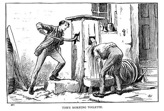You will not be surprised to hear that I got up the next morning feverish and unrefreshed, and I felt quite envious of Tom when I saw him holding his shortly-cropped bullet head under the spout of the pump in the back yard, waggling the handle awkwardly as he had what he called “a sloosh.”