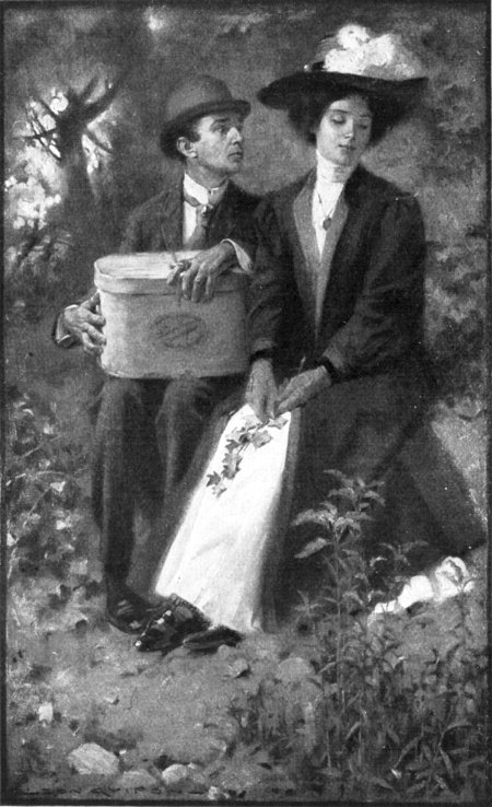 It was a blustery December night when he climbed the hill, and he had to pause several times during the ascent to gain sufficient breath to proceed. By the time he reached the house he was quite speechless, and he dropped on the steps to rest a moment before knocking. As he sat [p318] there trying to imagine the flying-machine or torpedo-boat upon which he felt certain Mr. Opp was engaged, he became aware of voices from within, and looking up, he saw the window above him was slightly raised. Overcome by his desire to see his friend at work upon his great invention, he cautiously tiptoed across the porch and peeped in.