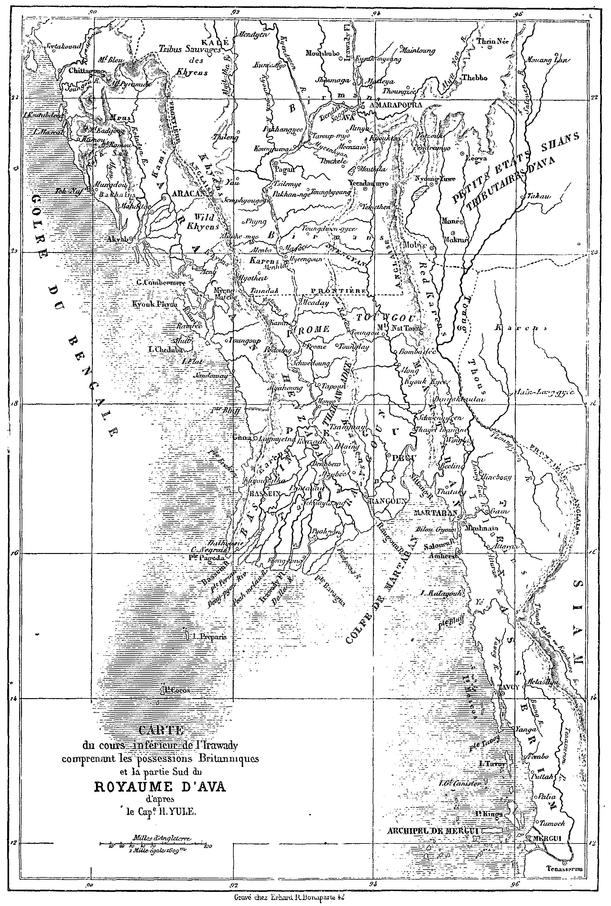 Lord Dalhousie, gouverneur général de l'Inde, ayant décidé l'envoi d'une ambassade près de la cour d'Ava, les membres de la mission, à laquelle il voulut bien m'adjoindre en qualité de secrétaire, se réunirent à Rangoun dans le courant de juillet 1855. Cette ville est célèbre par sa belle position commerciale et maritime au débouché de la navigation intérieure du Pégu et de l'Ava, ainsi que par sa grande pagode, un des sanctuaires les plus renommés de l'Indo-Chine.