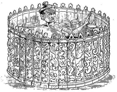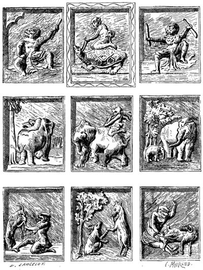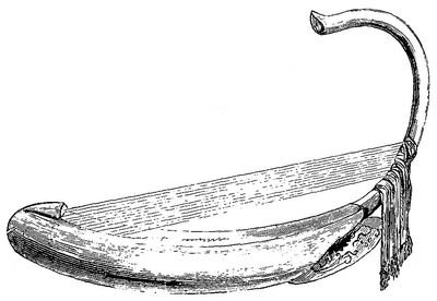 La députation était escortée de cinq ou six canots de guerre; c'était la première fois que nous rencontrions ces immenses embarcations; l'avant en est très-bas et très-fin; l'arrière, très-élevé, se recourbe au-dessus de l'eau; les rameurs, au nombre de quarante à soixante, sont deux sur chaque banc: tout l'extérieur du canot est doré, et toutes les rames le sont aussi. Les matelots, vigoureux et robustes, portaient tous leur conique chapeau de bambou; dans quelques canots ils étaient vêtus de mauvaises jaquettes noires d'uniforme. Des bandes de mousseline et des filets couverts de clinquant ornent les poupes élevées des canots de guerre, où flotte avec grâce une grande bannière blanche bordée d'argent, sur laquelle s'étale le blason de l'empire, un paon grossièrement dessiné. Souvent, à côté de l'oiseau oriental, une carafe européenne sert de pomme au mât de bambou auquel s'attache le pavillon. C'est un ornement très en faveur chez les Birmans, et parfois même une modeste bouteille à eau de Seltz domine la pointe extrême des pagodes. Un court mâtereau dressé à l'extrémité de la poupe des canots de guerre porte le htee[2], cet emblème royal et sacré. Ce n'est pas à l'arrière, comme en Europe, mais à l'avant du canot, sur une espèce de petite plate-forme, que se place le personnage le plus important du bord.