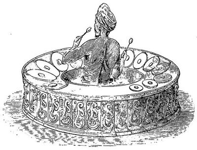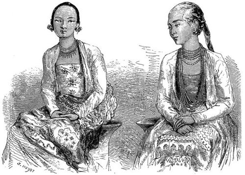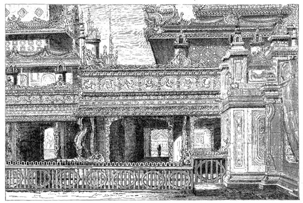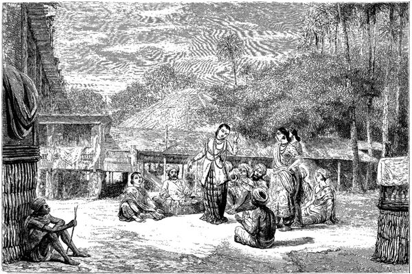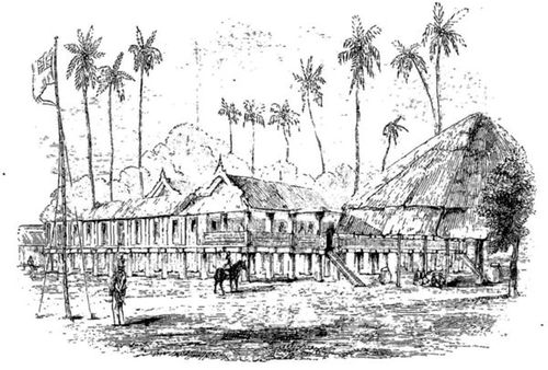 Nous débarquâmes et nous nous rendîmes à la résidence de Makertich. C'est une élégante construction en bambou, élevée sur piliers et entourée d'une palissade de même bois, selon la mode du pays. Une chambre tout à jour d'un côté, garnie de tapis indiens, servait de pièce de réception. Au fond de la salle, on voyait rangés sur un râtelier les fusils de la garde du gouverneur, qui habite, dans un coin de la cour, un petit corps de bâtiment, d'où les femmes regardaient curieusement les Kalàs (étrangers); les communs et les corps de garde étaient appuyés sur la clôture elle-même.