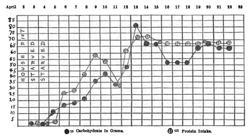 The Allen treatment was started with two starvation days. On the second he was sugar-free—but showed 2.6 grams of sugar the following day on 12 grams of carbohydrate and 40 grams of protein. (This was one of the earlier cases when the diet was raised too quickly after starvation.) After one more starvation day and two vegetable days he stayed sugar-free while the diet was raised slowly to 30 grams of carbohydrate and 45 grams of protein, calories about 2000. Discharged sugar-free on this diet.