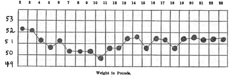 Two charts are kept for each case: one a food chart, with the amounts of the different articles of food taken each day, and the protein, carbohydrate, fat and caloric value figured out for each foodstuff; the second (see below) a more general chart, which shows graphically the progress of the case.