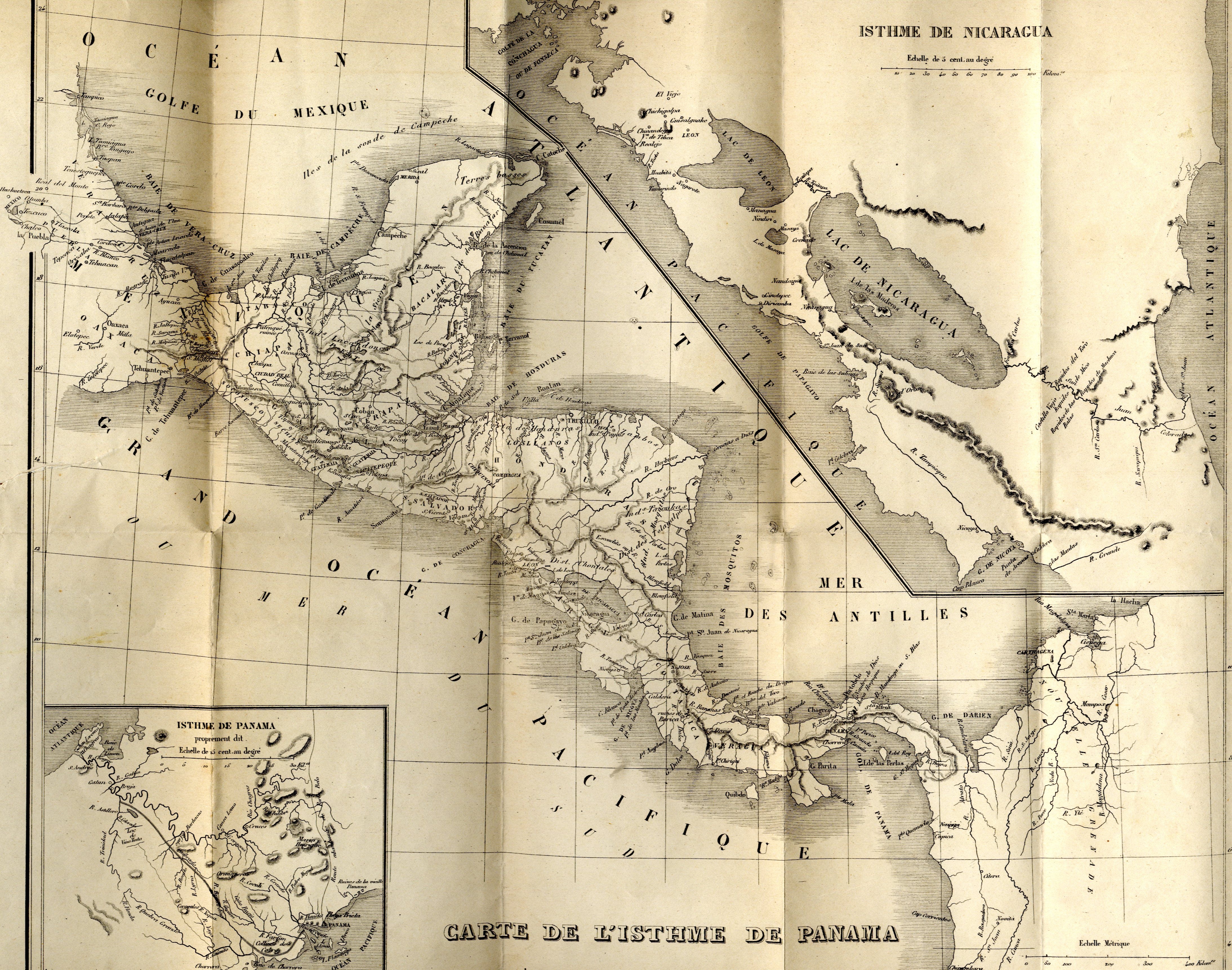 1.—En commençant par le nord, on rencontre d'abord l'isthme de Tehuantepec, où deux cours d'eau, le Guasacoalco et le Chimalapa, adossés l'un à l'autre, se déversent, l'un dans l'Océan Atlantique, l'autre dans le Pacifique. À vol d'oiseau, la distance qui sépare les deux mers est ici de 220 kilomètres.