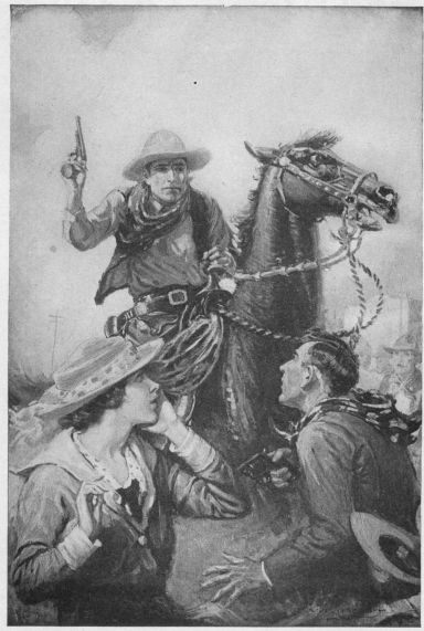 “The first time I clapped me eyes on wan av them cowbhoys I thought so, too,” said Carson. “That was back on the other section. But I seen so manny av them rigged out like thot, thot I comminced to askin’ questions. It’s a domned purposeful rig, mon. The big felt hat is a daisy for keepin’ off the sun, an’ that gaudy bit av a rag around his neck keeps the sun and sand from blisterin’ the skin. The leather pants is to keep his legs from gettin’ clawed up be the thorns 5 av prickly pear an’ what not, which he’s got to ride through, an’ the high heels is to keep his feet from slippin’ through the stirrups. A kid c’ud tell ye what he carries the young cannon for, an’ why he wears it so low on his hip. Ye’ve nivver seen him up close, eh Murph’? Well, I’m askin’ him down so’s ye can have a good look at him.” He stepped back from the boulder and waved a hand at Trevison, shouting: