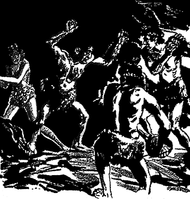 As the hunters of the Cro-Magnon tribe of Ugar saw the meat which the Neanderthalers were tearing, a cry of wrath broke from them. Uglik stepped forward and raised the war cry of the tribe. The Neanderthalers looked stupidly down at him for a moment. The huge male dropped the meat he was eating and rose, his mane and beard bristling with rage. With a roar, he charged down the slope, a huge flint smiting-stone in either hand.