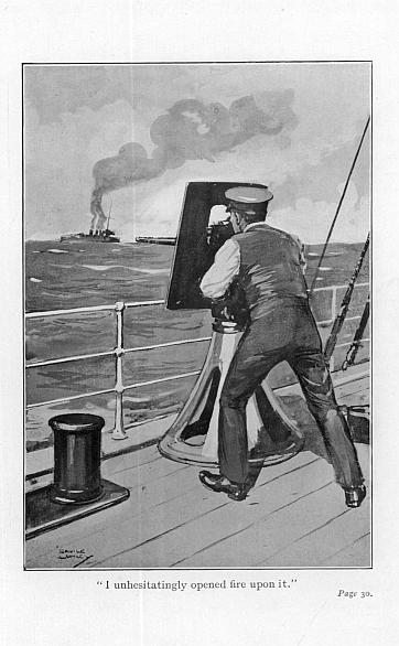 The skipper’s response was to send for the chief officer, who, at least nominally, was off duty for the time being; and five minutes later I was on the forecastle-head, the Hotchkiss’ tarpaulin jacket was off, a case of ammunition for the weapon stood conveniently at hand, and “All ready for’ard!” I reported. A minute or two later, Nakamura on the bridge was also ready, with a belt of cartridges in each of his Maxims, and more at hand, if required. Meanwhile, by the skipper’s order, the answering pennant had been run up to our span, and dipped to show that the signal was understood, while the Japanese mercantile flag—white, with a red ball in the centre, which is also the Japanese “Jack”—was hoisted at our gaff-end.