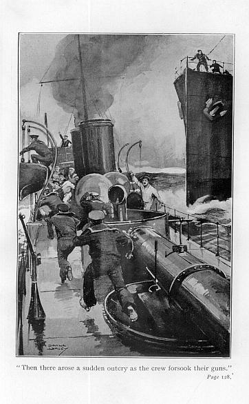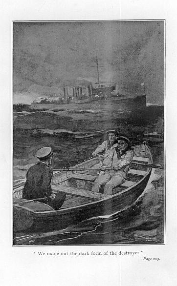 Ten minutes later we were within hail of the destroyer, which, flying the Russian naval ensign, was lying motionless right athwart our hawse, broadside-on to us. Our engines were still running at full speed, and our safety valves were lifting, allowing a “feather” of steam to show at the head of our waste-pipe, while our quartermaster grimly kept our stem pointed fair and square between the second and third funnels of the Russian.