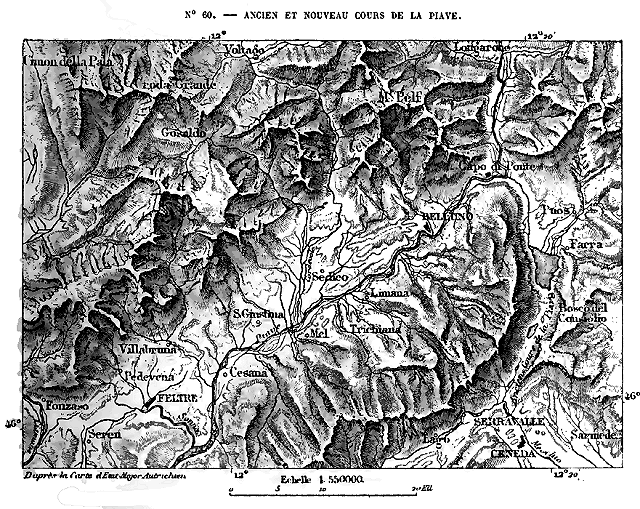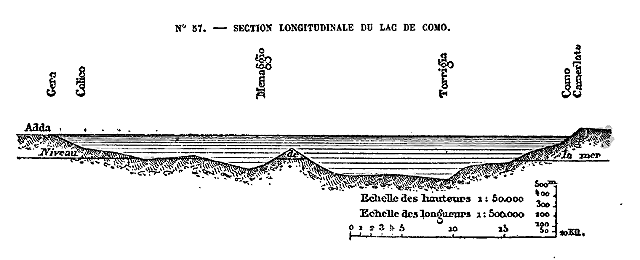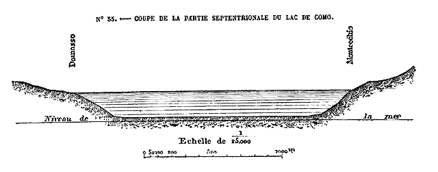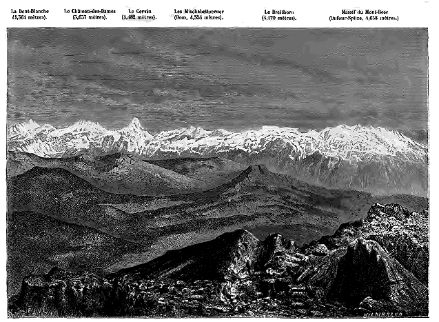 Dans la partie occidentale du système alpin, c'est-à-dire de la Méditerranée au massif du mont Blanc, point culminant de l'Europe, la hauteur moyenne des groupes de montagnes augmente par degrés de 2,000 mètres à plus de 4,000. A l'est du grand bassin angulaire des Alpes, formé par le mont Blanc, le système change de direction; puis, au delà des deux puissantes citadelles du mont Rose et de l'Oberland, il s'abaisse peu à peu. A l'Orient des Alpes suisses, aucune cime n'atteint la hauteur de 4,000 mètres, et l'élévation moyenne des montagnes diminue d'un tiers environ; mais là où la région montagneuse est moins haute, elle devient graduellement plus large à cause de l'écartement des massifs et de la divergence des chaînes. Tandis que l'axe principal continue vers le nord-est la direction des Alpes helvétiques, des chaînes très-considérables, qui doublent l'épaisseur de la masse, se projettent au nord, à l'est et au sud-est. Par le travers de Vienne, les Alpes proprement dites n'ont pas moins de 400 kilomètres de large.
