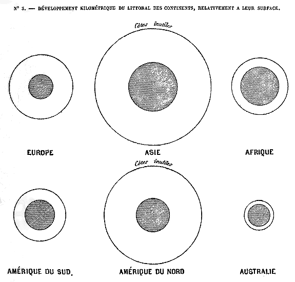 En surface, l'Europe est deux fois moindre que l'Amérique méridionale et trois fois plus petite que l'énorme masse africaine, et cependant elle est supérieure à ces deux continents par le développement de son littoral; proportionnellement à son étendue, elle a le double des rivages de l'Amérique du sud, de l'Australie et de l'Afrique; elle en a un peu moins que l'Amérique du nord, mais ce dernier continent n'a la grande richesse de ses côtes que dans les régions des froidures et des glaces persistantes. 21 Ainsi que l'on peut s'en faire une idée en jetant les yeux sur le diagramme suivant, l'Europe a, sur les deux autres continents que baigne la mer glaciale arctique, le privilége de posséder un littoral presque en entier utile á la navigation, tandis qu'une grande partie des côtes de l'Asie et de l'Amérique du nord est actuellement sans valeur pour l'homme. Et non-seulement la mer pénètre au loin dans l'intérieur de l'Europe tempérée pour la découper en longues péninsules, mais encore elle entaille chacune de ces presqu'îles pour y former des multitudes de golfes et de méditerranée en miniature. Toutes les côtes de la Grèce, de la Thessalie, de la Thrace sont ainsi dentelées par des golfes en hémicycle et de larges 22 bassins pénétrant dans les terres; l'Italie et l'Espagne offrent également sur tout leur pourtour une série de golfes et d'indentations en arcs de cercle; enfin, les péninsules du nord de l'Europe, le Jutland et la Scandinavie, sont aussi tailladées par les eaux marines en de nombreuses presqu'îles secondaires.