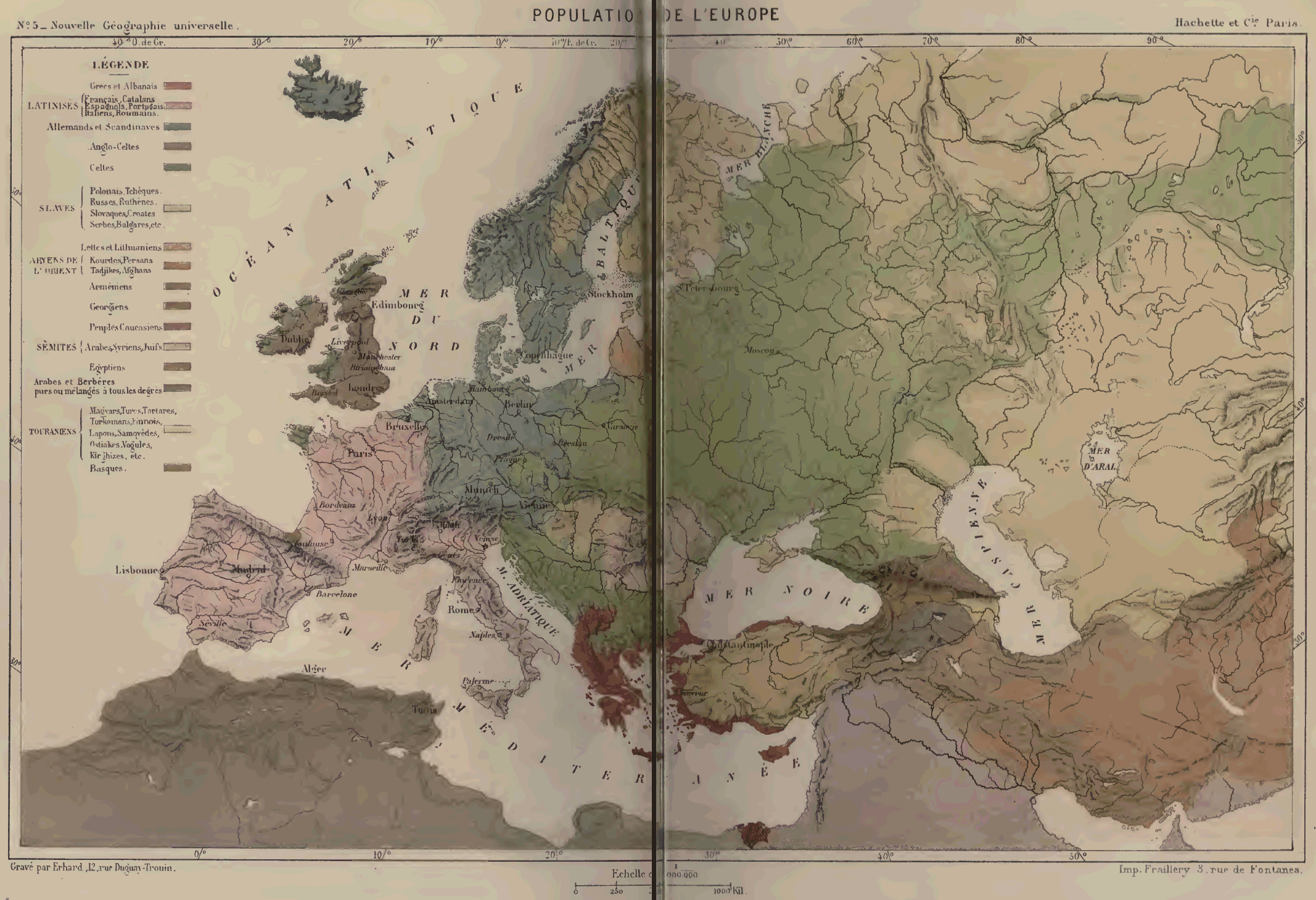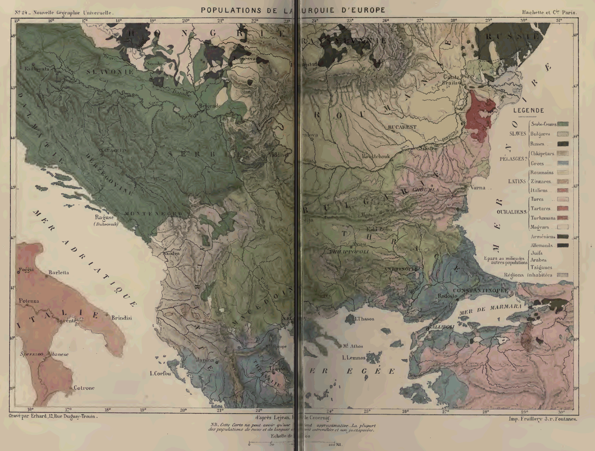 Les Slaves forment le troisième groupe des peuples européens: un peu moins nombreux que les Gréco-Latins, ils occupent un territoire beaucoup plus étendu: presque toute la Russie, la Pologne, une grande partie de la péninsule des Balkhans, une moitié de l'Austro-Hongrie. A l'orient des Carpathes, toutes les grandes plaines sont habitées de Slaves purs ou croisés avec les Tartares et les Mongols; mais à l'ouest et au sud des montagnes la race se trouve partagée en de nombreuses populations distinctes, 30 au milieu d'un chaos d'autres nations. Dans ce dédale des pays danubiens, les Slaves se rencontrent avec les Roumains de langue latine, ainsi qu'avec deux races d'origine asiatique, et d'une importance secondaire par le nombre, les Turcs et les Magyars. De ce côté, les mondes slave et gréco-latin sont donc, en grande partie, séparés par une zone intermédiaire de peuples de souches différentes. Vers le nord, les Finlandais, les Livoniens, les Lettes, s'interposent entre les Slaves et les Germains.