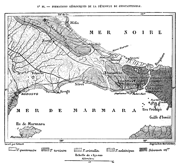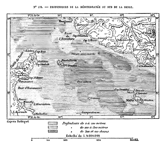 Sans parler des changements qui ont dû s'opérer dans la configuration de l'Europe pendant les périodes géologiques antérieures, il est certain que, durant l'époque moderne, la forme du continent s'est grandement modifiée. Si l'Europe était autrefois séparée de l'Asie occidentale par un large bras de mer, en revanche, il fut un temps où elle tenait à l'Anatolie par la langue 12 de terre où s'est ouvert depuis le détroit de Constantinople. De même, l'Espagne se reliait à l'Afrique avant que les eaux de l'Océan eussent fait irruption dans la Méditerranée, et probablement aussi la Sicile se rattachait à la Mauritanie. Enfin, les îles Britanniques taisaient partie du tronc continental. Les érosions de la mer, en même temps que les exhaussements et les dépressions des terrains, n'ont cessé et ne cessent encore de modifier les contours du littoral. Les nombreux sondages opérés dans les mers qui baignent l'Europe occidentale ont révélé l'existence d'un plateau sous-marin, qui, au point de vue géologique, doit être considéré comme partie intégrante du continent. Entouré d'abîmes de plusieurs milliers de mètres de profondeur, et recouvert en moyenne de 50 à 200 mètres d'eau, ce piédestal de la France et des îles Britanniques n'est autre chose que la base de terres anciennes démolies par le travail continu des vagues: c'est la fondation ruinée d'un édifice continental disparu. Ajoutées à l'Europe, toutes les berges sous-marines du littoral de l'Océan et celles de la Méditerranée accroîtraient d'un quart environ la superficie du continent; mais, en même temps, elles lui raviraient cette richesse de péninsules qui a valu à l'Europe sa prépondérance historique sur les autres parties du monde.