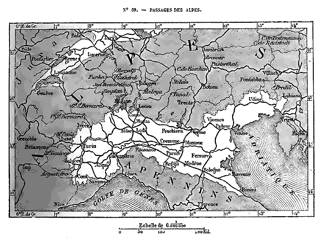 L'épaisseur des Alpes et de tous ses avant-monts, du Pinde aux Carpathes, séparait donc vraiment deux mondes distincts où la marche de l'histoire devait s'accomplir différemment. Toutefois, même en l'absence de routes, la séparation n'était pas complète entre les deux versants. Nulle part le système des Alpes n'offre, comme les Andes et les monts du Tibet, de larges plateaux froids et déserts, posant leur masse énorme en barrière infranchissable. Partout les massifs alpins sont découpés en monts et en vallées; partout le climat général du pays est assez doux pour que les populations puissent vivre et se propager. Les montagnards, assez bien protégés par la nature pour qu'il leur fût aisé de maintenir leur indépendance, servaient jadis d'intermédiaires entre les peuples des plaines opposées: c'est par eux que se faisaient les rares échanges entre le Nord et le Midi et que les premiers sentiers de commerce se frayèrent entre les sommets. Les points où de larges routes, où des chemins de fer devaient un jour franchir le rempart des montagnes et mettre les populations en rapport de 19 guerre ou d'amitié, étaient indiqués d'avance par la direction des vallées et les profondes échancrures des cols. La partie des Alpes qui devait cesser la première d'arrêter la marche des peuples en armes est celle qui se dirige du nord au sud, entre les massifs de la Savoie et ceux du littoral méditerranéen. En cet endroit le système alpin, quoique très-haut, est réduit à sa moindre largeur; en outre, les climats se ressemblent sur les deux versants opposés des groupes du Cenis et du Viso, et par suite les populations se trouvent beaucoup plus rapprochées par les moeurs et le genre de vie. La région des Alpes qui se développe au delà du mont Blanc, dans la direction du nord-est, est une barrière bien autrement sérieuse, car elle sert de limite entre deux climats différents.