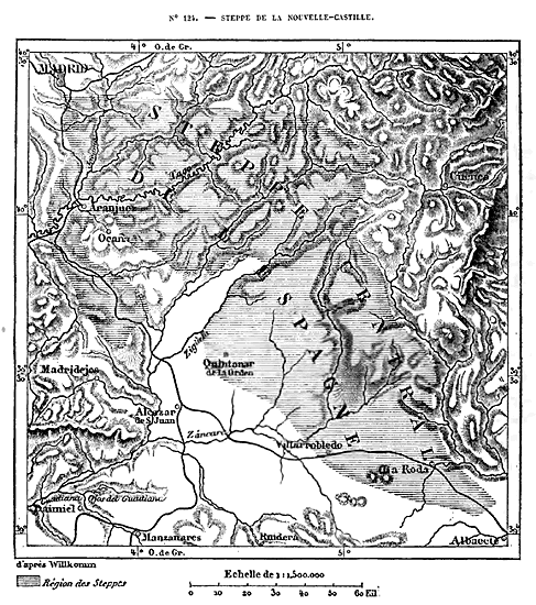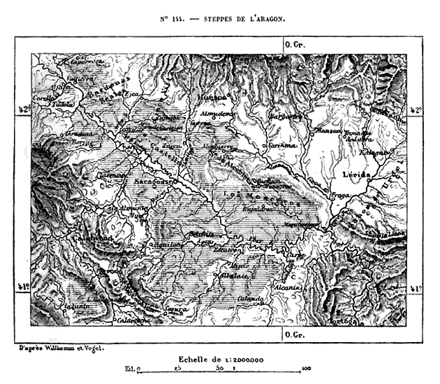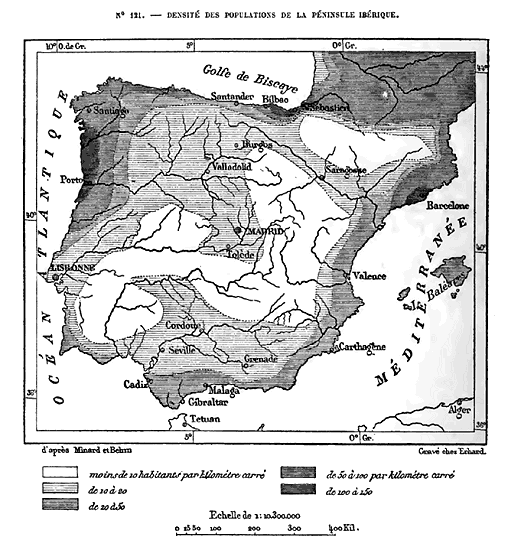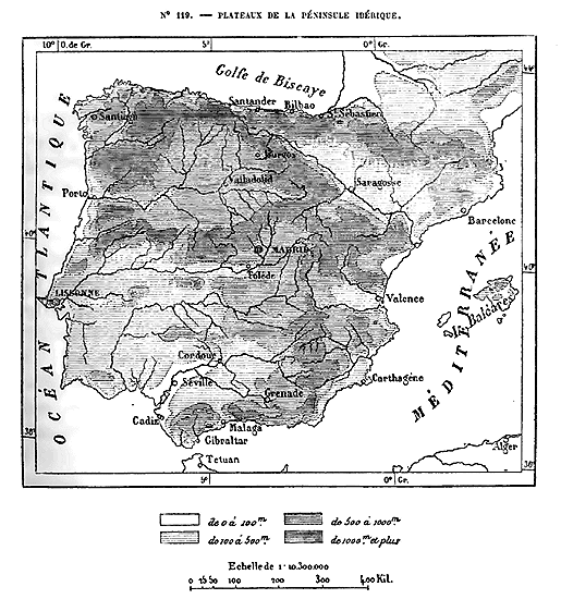 Cette Europe en résumé, qui comprend, en outre des trois péninsules méditerranéennes, la France, l'Allemagne et l'Angleterre, se divise naturellement en plusieurs parties. Les îles Britanniques forment un premier groupe nettement séparé, grâce à la ceinture de mers qui l'environne. La presqu'île hispanique n'est guère moins distincte du reste de l'Europe, car elle vient confiner à la France par un véritable rempart de montagnes, le plus difficile à franchir qui existe dans le continent; en outre, une profonde dépression, dont le seuil de partage n'a pas même 200 mètres, 14 réunit l'Océan et la Méditerranée, immédiatement au nord de l'Espagne. L'unité géographique n'est complète que pour le système des Alpes et les chaînes de montagnes qui s'y rattachent, en France, en Allemagne, en Italie et dans la péninsule hellénique: c'est là que se trouve la charpente de l'édifice continental.