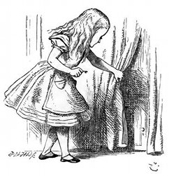 Tutt'a un tratto capitò vicina a un piccolo tavolino di cristallo solido e sorretto da tre piedi: non c'era altro su d'esso che una chiavettina d'oro: or la prima idea ch'ebbe Alice fu che quella potesse aprire uno degli usci della sala; e provò—ma oimè! o le toppe erano troppo[8] grandi, o la chiavettina era troppo piccola; ma comunque fosse, non potette aprirne alcuno. Ciò non di meno, avendo fatto un secondo giro nella sala, capitò davanti a una cortina bassa che non aveva osservata prima, e dietro ad essa v'era un piccolo uscio, alto quindici pollici o giù di lì: provò la chiavettina d'oro se andasse alla toppa, e con molta allegrezza vide che c'entrava per l'appuntino!