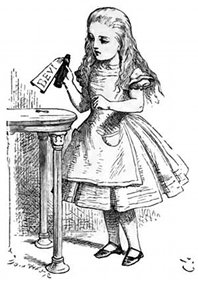 Era proprio tempo perso star lì piantata davanti all'usciolino, perciò Alice ritornò verso la tavola con una mezza speranza di potervi trovare sopra un'altra chiave, o almeno un libro il quale insegnasse alla gente a riserrarsi come un cannocchiale: questa volta vi trovò un'ampolla, ("e certo non c'era prima," disse Alice,) e aveva attaccato al collo un cartello sul quale a lettere di scatola era magnificamente scritta questa parola "BEVI."