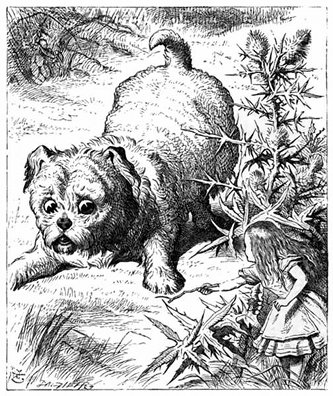 Alice lo richiamò con un soave tuono di voce, "Sorcio caro, ritorni pure, ed io le prometto che non parlerò più di gatti nè di cani!" A queste parole, il Sorcio si rivoltò indietro, nuotando lentamente verso di lei: la sua faccia era pallida (di rabbia, pensò Alice), e disse con voce sommessa e tremante, "Approdiamo alla spiaggia, e le racconterò[28] la mia storia, allora lei capirà perchè io detesti tanto i gatti e i cani."