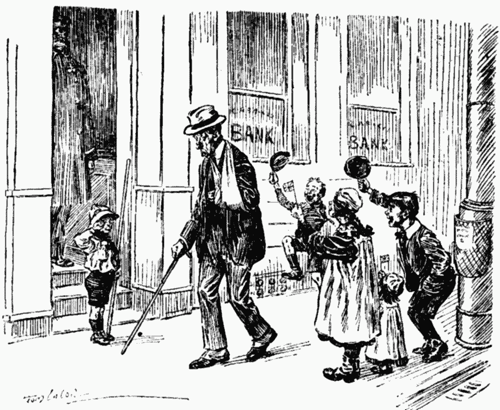 Obvious embarrassment of Little Binks, who has injured his hand in the peaceful occupation of picture-hanging, at being mistaken for a wounded hero.