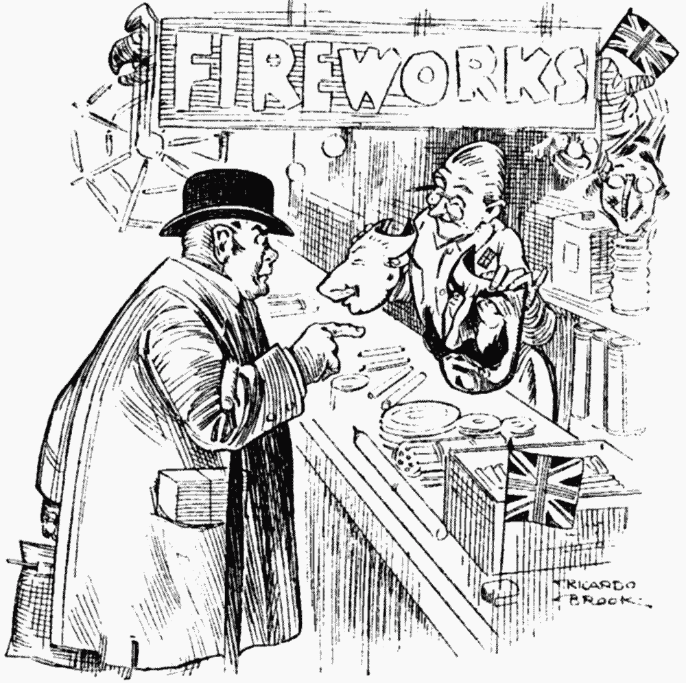 "Friends all," said. Mr. Flodden, "we've kep' ourselves respectable in this village. Even our guys have been respectable, though, mind you, that Lloyd George—well, if it wasn't wartime, I'd say he come precious near the line. Now what's the good of us letting ourselves down to burn these 'Uns? What about old Guy Fawkes? I grant you he wanted to blow up the 'Ouses of Parliament; but, if there was licensing bills in those days, I don't blame him. I say stick to old Guy and be respectable."