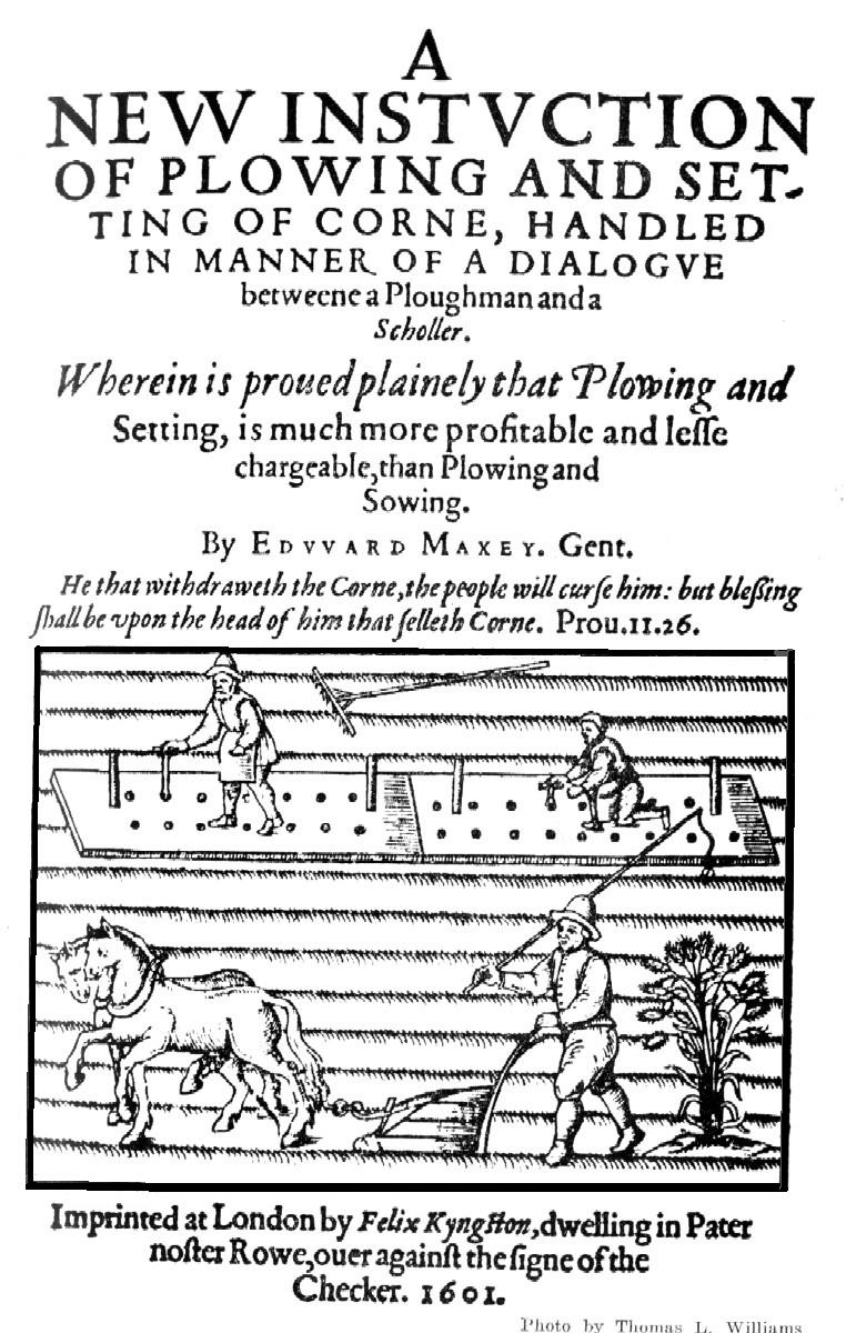 As already noted, the initial attempts of the colonists to grow the grains with which they had been accustomed in England came to naught. They were familiar with wheat, rye, barley and oats. To make satisfactory yields, these grains had to be broadcasted on well prepared seed beds. Newly cleared forests left the soil full of stumps and roots. The wooden plows of those days were useless on these newly cleared lands. Preparation of the soil, for tobacco or maize, could be accomplished with a hand hoe or shovel. These plants required space in which to develop their full growth. A tobacco plant could be set or a hill of corn planted wherever a little loose dirt could be found. Some English grains were seeded in the cleared land near Hampton and Newport News but these old fields, abandoned by the Indians, were also near to exhaustion. An "indifferent crop" was reported.