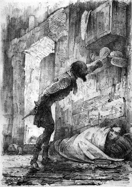 Sein Herz schlug dabei so laut und heftig daß er zu fürchten anfing die kleine lauernde Gestalt des Juden müsse das hören, wie er aber diesen jetzt langsam, mit vorsichtig zurückgezogenem Stahl gegen sich anschleichen sah, ja den Fuß des Mörders schon an dem seinen fühlte, als sich dieser über ihn hinbog, und mit dem linken, ausgestreckten Arm nach der Wand fühlte, sich jedenfalls dort zu stützen und seinem Stoß mehr Sicherheit zu geben, war auch fast jede Angst, die ihn bis dahin wohl noch bedrückt, verschwunden.