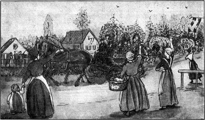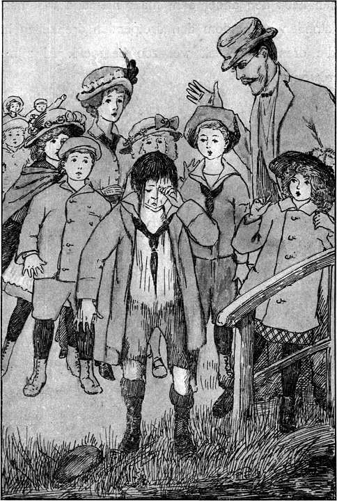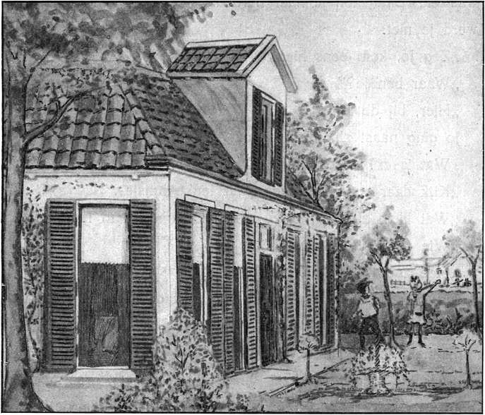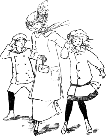 Een uurtje later liepen een dame en twee kinderen door de bijna verlaten straten. De wind woei om de hoeken heen met zooveel kracht, dat het drietal er met moeite tegenin kon komen. En de wolken lieten droppels vallen; eerst enkele, maar weldra meer en meer.