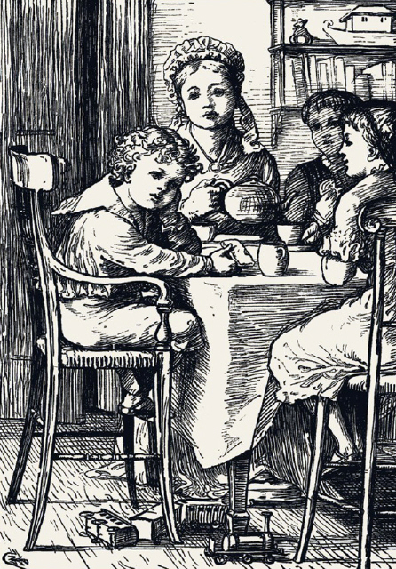 Denny was getting ready an answer when Lisa, who knew pretty well the signs of war between Fritz and Denny, called to all the children to come to tea; and as both Fritz and Denny were great hands at bread and butter, they forgot to quarrel, and began pulling their chairs in to the table, and in a few minutes all four were busy at work.