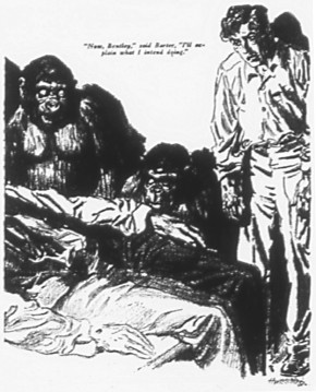 “You see? Brains are all right, he says, but the white race needs new bodies. If he isn’t suggesting brain substitution, what is he suggesting? Though I confess I never thought of your story until your name was sent in to me a while ago. For the world thinks of Barter as having been killed by the great apes.”