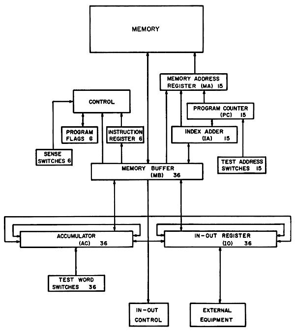 The Central Processor of PDP-3 contains the Control Element, the Memory Buffer Register, the Arithmetic Element, and the Memory Addressing Element. The Control Element governs the complete operation of the computer including memory timing, instruction performance, and the initiation of input-output commands. The Arithmetic Element, which includes the Accumulator, the In-Out Register, and the Carry Storage Register, performs the arithmetic operations. The Memory Addressing Element which includes the Index Adder, the Program Counter, and the Memory Address Register, performs address bookkeeping and modification.