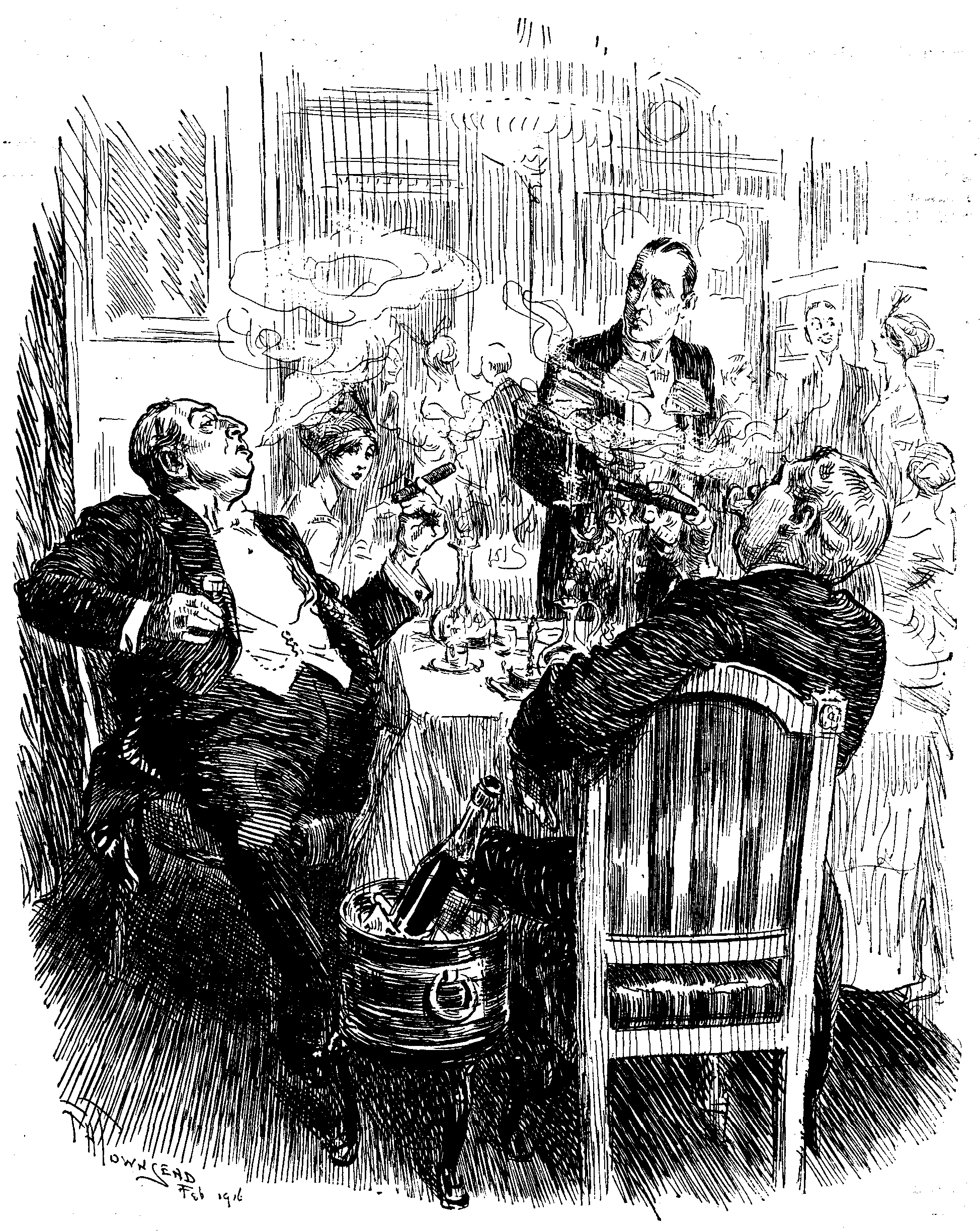 Irritated by the pro-German conversation of one of the guests at an American dinner-party the English butler poured the gravy over him. The story is believed to have greatly annoyed the starving millionaires in Berlin. They complain that their exiled fellow-countrymen get all the luck.