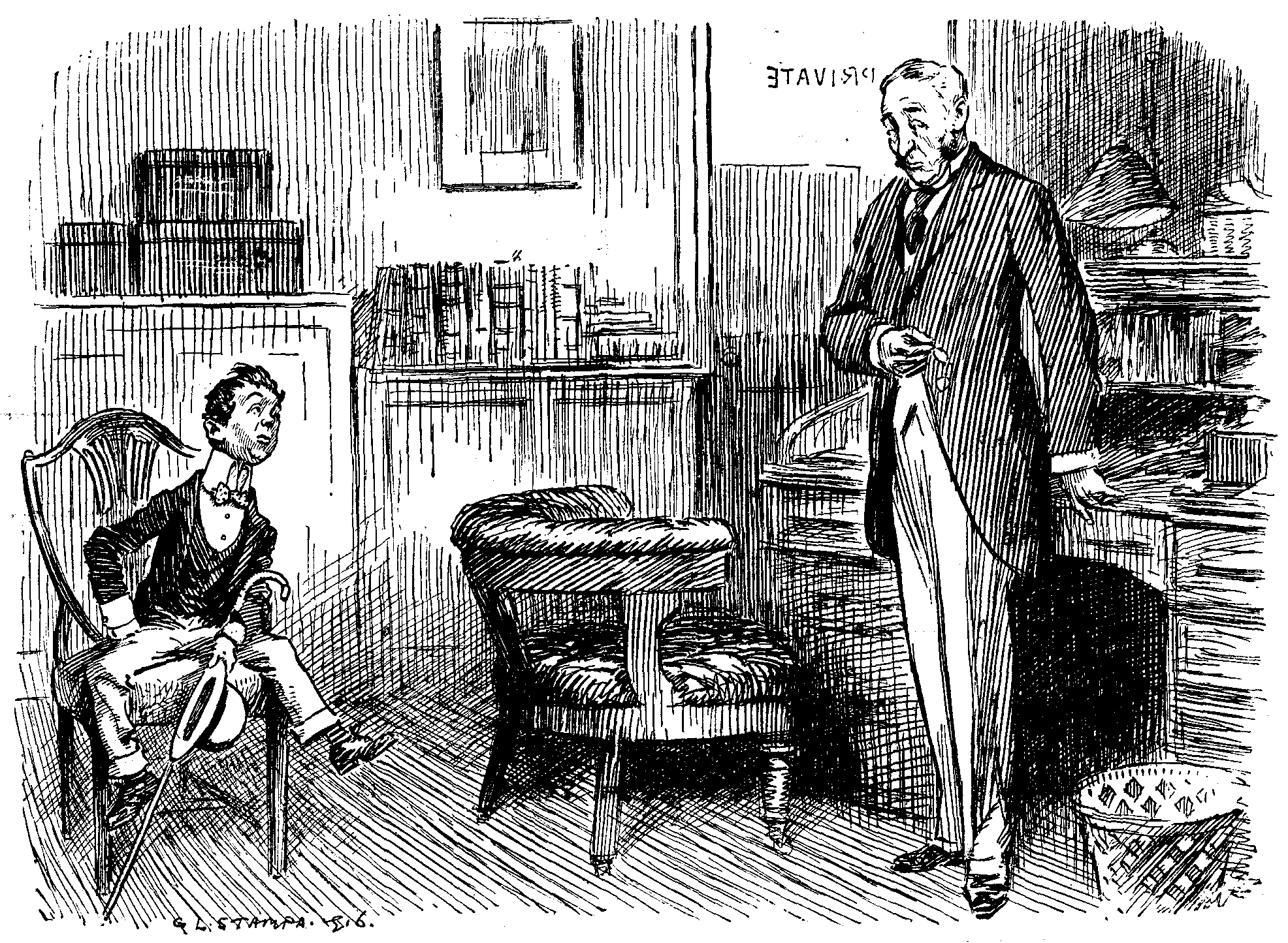 I have always been very fond and proud of my niece Celia. With an exceptionally attractive appearance and a personal fascination that is irresistible she combines the sweetest and most unselfish nature it has ever been my good fortune to meet. Indeed, she has so excessive a consideration for the feelings of everybody but herself that she drifts into difficulties which she might have avoided by a little more firmness. As, for example, in the case of Jillings. Celia and Jack have been married six years; he is about twelve years older than she, and a capital good fellow, though he is said to have rather a violent temper. But he has never shown it with Celia—nobody could, had left the Army on his marriage and settled down in a pretty little place in Surrey, but of course rejoined the Service as soon as the War broke out. So long as he was in training with his regiment she took rooms in the neighbourhood, but when he was ordered to the Front about a year ago she and the children returned to the Surrey home, and it was then that Celia engaged Jillings as parlourmaid. I saw her shortly afterwards when I went down to stay for a night, and was struck by the exuberant enthusiasm with which she waited—not over efficiently—at table. Celia remarked afterwards that Jillings was a little inexperienced as yet, but so willing and warm-hearted, and with such a sensitively affectionate disposition that the least hint of reproof sufficed to send her into a flood of tears.