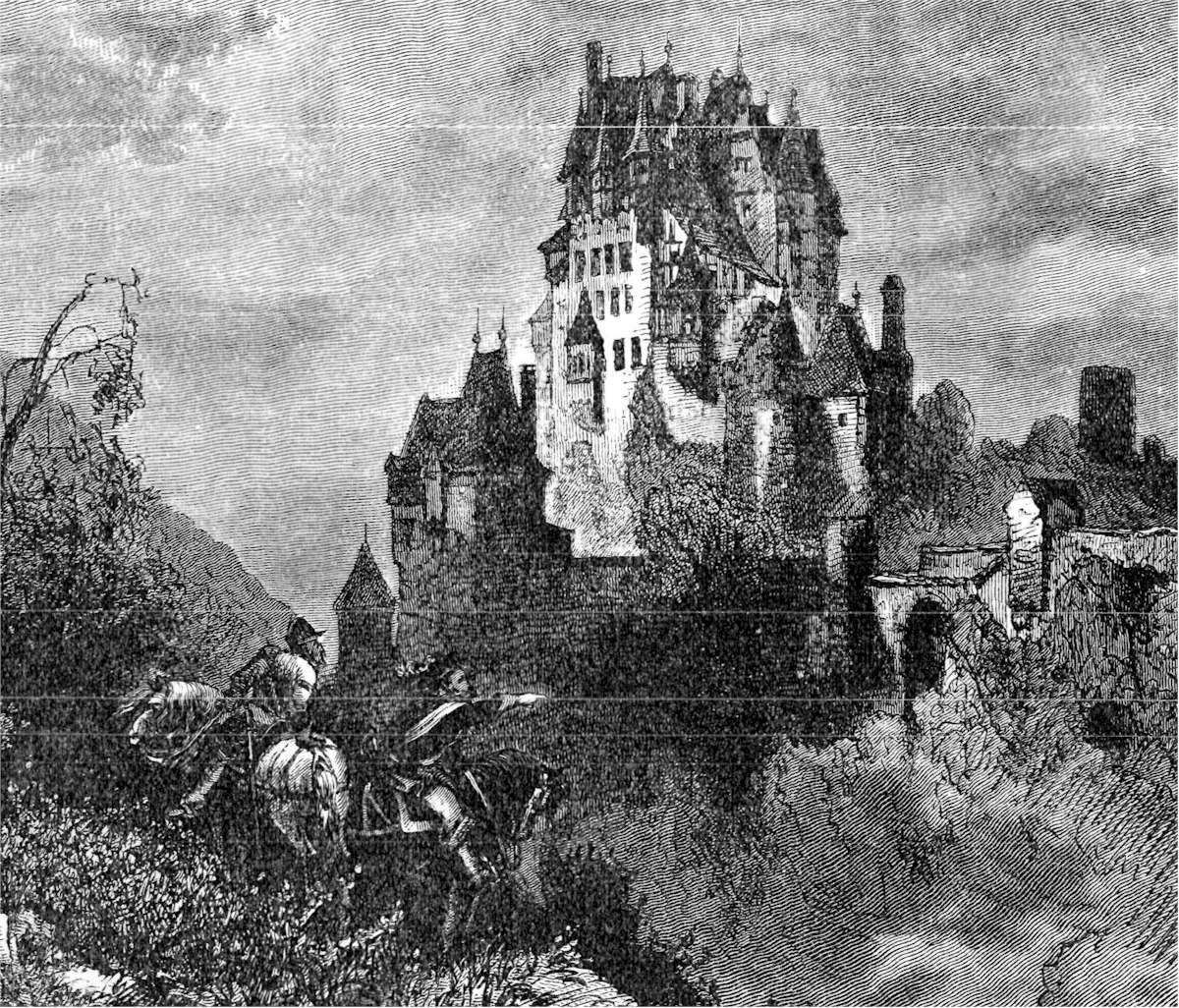 The last glance we take at the beauties of this neighborhood is from the mouth of the torrent-river Eltz as it dashes into the Eifel, washing the rock on which stands the castle of Eltz. The building and the family are an exception in the history of these lands: both exist to this day, and are prosperous and undaunted, notwithstanding all the efforts of enemies, time and circumstances to the contrary. The strongly-turreted wall runs from the castle till it loses itself in the rock, and the building has a home-like, inhabited, complete look; which, in virtue of the quaint irregularity and magnificent natural position of the castle, standing guard over the foaming Eltz, does not take from its romantic appearance, as preservation or restoration too often does.[Pg 141]