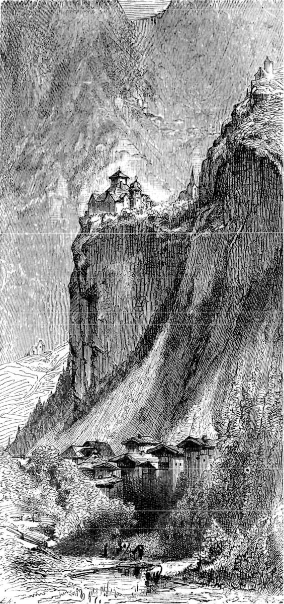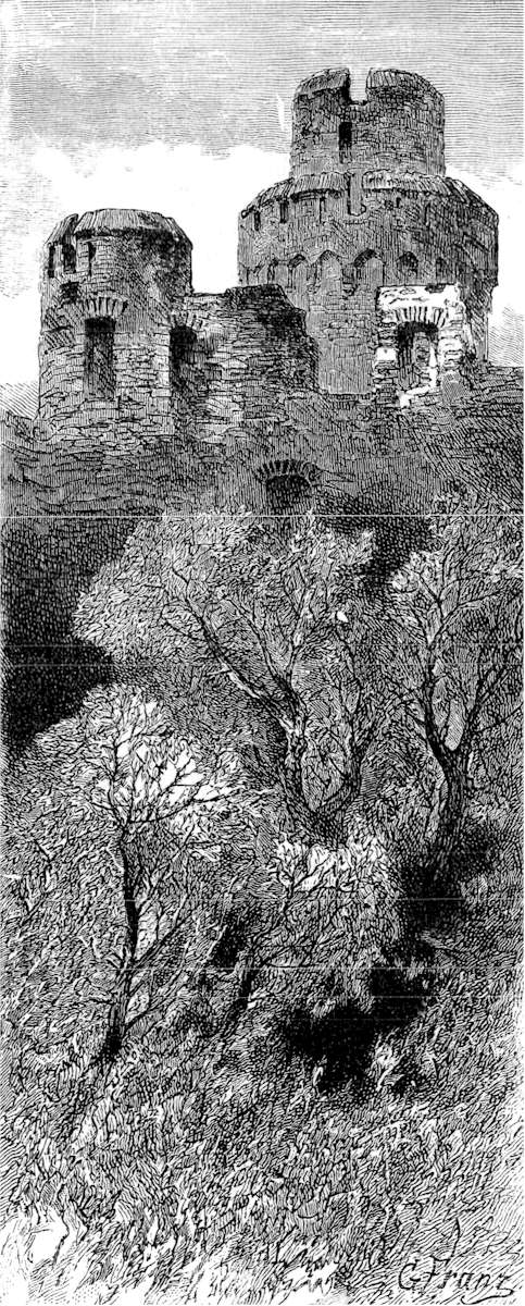 The Mosel has but few tributary streams of importance: its own course is as winding, as wild and as romantic as that of the Rhine itself. The most interesting part of the very varied scenery of this river is not the castles, the antique towns, the dense woods or the teeming vineyards lining rocks where a chamois could hardly stand—all this it has in common with the Rhine—but the volcanic region of the Eifel, the lakes in ancient craters, the tossed masses of lava and tufa, the great wastes strewn with dark boulders, the rifts that are called valleys and are like the Iceland gorges, the poor, starved villages and the extraordinary rusticity, not to say coarseness, of the inhabitants. This grotesque, interesting country—unique, I believe, on the continent of Europe—lies in a small triangle between the Mosel, the Belgian frontier and the Schiefer hills of the Lower Rhine: it goes by the names of the High Eifel, with the High Acht, the Kellberg and the Nürburg; the Upper (Vorder) Eifel, with Gerolstein, a ruined castle, and Daun, a pretty village; and the Snow-Eifel (Schnee Eifel), contracted by the speech of the country into Schneifel. The last is the most curious, the most dreary, the least visited. Walls of sharp rock rise up over eight hundred feet high round some of its sunken lakes—one is called the Powder Lake—and the level above this abyss stretches out in moors and desolate downs, peopled with herds of lean sheep, and marked here and there by sepulchral, gibbet-looking signposts, shaped like a rough T and set in a heap of loose stones. It is a great contrast to turn aside from this landscape and look on the smiling villages and pretty wooded scenery of the valley of the Mosel proper; the long lines of handsome, healthy women washing their linen on the banks; the old ferryboats crossing by the help of antique chain-and-rope contrivances; the groves of old trees, with broken walls and rude shrines, reminding one of Southern Italy and her olives and ilexes; and the picturesque houses in Kochem, in Daun, in Trarbach, in Bernkastel, which, however untiring one may be as a sightseer, hardly warrant one as a writer to describe and re-describe their beauties. Klüsserath, however, we must mention, because its straggling figure has given rise to a local proverb—"As long as Klüsserath;" and Neumagen, because of the legend of Constantine, who is said to have seen the cross of victory in the heavens at this place, as well as at Sinzig on the Rhine, and, as the more famous legend tells us, at the Pons Milvium over the Tiber.
