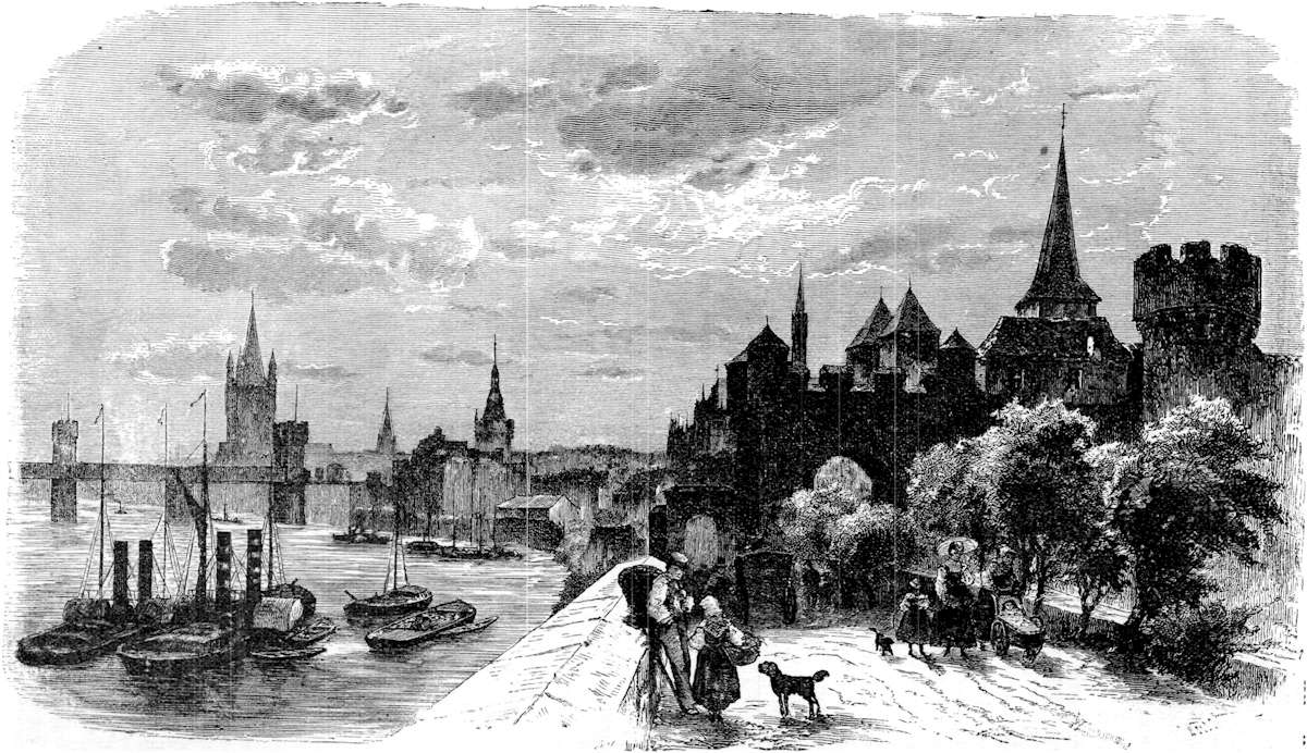 "Holy Cologne" seems at first an impersonation of the olden time, but its busy wharves, crowded shipping and tall warehouses tell us another tale. Indeed, Cologne is more rich than holy, and its commercial reputation is quite as old as its religious one. The country around is flat and uninteresting, but Cologne merchants have made Brühl a little paradise in spite of this; and their country-houses of all styles, with balconies, verandas, porches, piazzas, English shrubbery and flower-gardens, conservatories and gay boats, lawns and statues, make even the monotonous banks of the sluggish Rhine beautiful in spite of Nature. Then comes a reminder of old times—the towers and fortifications, which are still standing, though now turned into public gardens and drives that stretch out both on the river and the land side; but the former, Am Thürmchen, forming a sort of parapeted quay, crossed by massive battlemented gateways, is the most fashionable and commands the best views. The trees almost hide the shipping, as their predecessors no doubt did eighteen hundred years ago and more, when the Ubier tribe of barbarians, a commercial as well as warlike people, undertook to ferry over the whole of Cæsar's army to the right bank of the Rhine in their own boats. The quays swarm now with hotels, and these in summer swarm with strangers from all countries—pilgrims of Art and Nature, if no longer of religion—and the old town becomes in their eyes less a solid, real city with a long history than a museum opened for their special behoof. And indeed these German places seem to take kindly to this part, for they rival each other in modern amusements and gauds set out to lure the light-minded. Music-halls and beer-gardens, theatres and cafés, illuminated promenades and stalls full of tempting flagons labeled "genuine eau de Cologne," are cunningly arrayed to turn away the mind from the stately antique churches and houses of Cologne. Every one has heard of the cathedral, many have seen it, and more have seen at least photographs of great accuracy, and pictures of it which, if less strict in detail, give it a more lifelike look and include some of its surroundings. The church of St. Gereon, a martyr of the Theban Legion massacred at Cologne to a man for refusing to worship the imperial ensigns, under which no one denied that they had fought like lions, is a massive Romanesque building older than the cathedral, dating from the days of Constantine and Saint Helena. The church of the Holy Apostles is a basilica with rounded apse and four octagon towers, one at each corner of the nave. St. Peter's church, the interior terribly modernized by the Renaissance, has for an altar-piece Rubens's picture of the Crucifixion of Saint Peter. The Gürzenich House, now used for public balls and imperial receptions, is a magnificent fifteenth-century building, adorned with dwarf towers at each corner, a high, carved and stone-roofed niche with statue over the round-arched door, transom windows filled with stained glass, and carvings of shields, animal heads, colonnettes and other devices between and above these windows. The council-house or town-hall has a beautiful colonnade supporting arches, and a quaint nondescript creature whose abyss-like maw opens wide and gapes horribly at the beholder each time the clock strikes. A bas-relief in the hall represents a curious incident in the civic history of the town, the successful struggle of Burgomaster Gryn with a lion, the show and pet of some treacherous nobles who invited Gryn to dinner, and under pretence of showing him their very unusual acquisition, pushed him into the stone recess and closed the gate upon him. The burgomaster thrust his hand and arm, wrapped in his thick cloak, down the animal's throat, while he pierced him[Pg 151] through and through with the sword in his other hand. The struggles between Cologne and her archbishops were hot and incessant, much as they were in other ecclesiastical sovereignties. Of these there is no longer a trace in the present, though the might of the burghers exists still, and the city that was once called the kernel of the Hanseatic League, and boasted of its Lorenzo de' Medici in the person of the good and enlightened Matthias Overstolz, has now almost as proud a place among merchants as Hamburg or Frankfort. Before we pass to more modern things let us not forget the shrine of the Three Kings in the cathedral, which is simply a mass of gold and jewelry, in such profusion as to remind one of nothing less than the golden screen studded with uncut gems called the Palla d'Oro at San Marco, directly behind the high altar, and the Golden Frontal of St. Ambrose at Milan—golden altar it might more fitly be named, as each side of the altar is a slab of solid gold, almost hidden by its breastplate of precious stones. The same warrior-archbishop, Conrad of Hochstaden, who, driven from Cologne, transferred his see to Bonn, was the [Pg 152]first founder of the cathedral, though in those days of slow and solid building to found was not to finish. The cathedral is not finished even yet. The present scenes in which Cologne shines are many—for instance, its lively market on the Neumarkt, and the country costumes one sees there each week as the stalls and carts, easily drawn by dogs and donkeys, are set up in the square; the parade of the old guard, called the "Sparks of Cologne" from their scarlet uniforms; and the Carnival, a high opportunity for fun and display, and specially seized upon to reproduce historic figures and incidents, such as the half-comic Gecker-Berndchen, a typical figure in red and white, the colors of the town, with a shield in one hand and a wooden sabre in the other, shouting the traditional warning cry, "Geck los Geck elans!" the antique procession of burgher youths and maidens, the latter with large white caps and aprons, and the former in three-cornered hats, black breeches and stockings and thick low shoes. Then fo