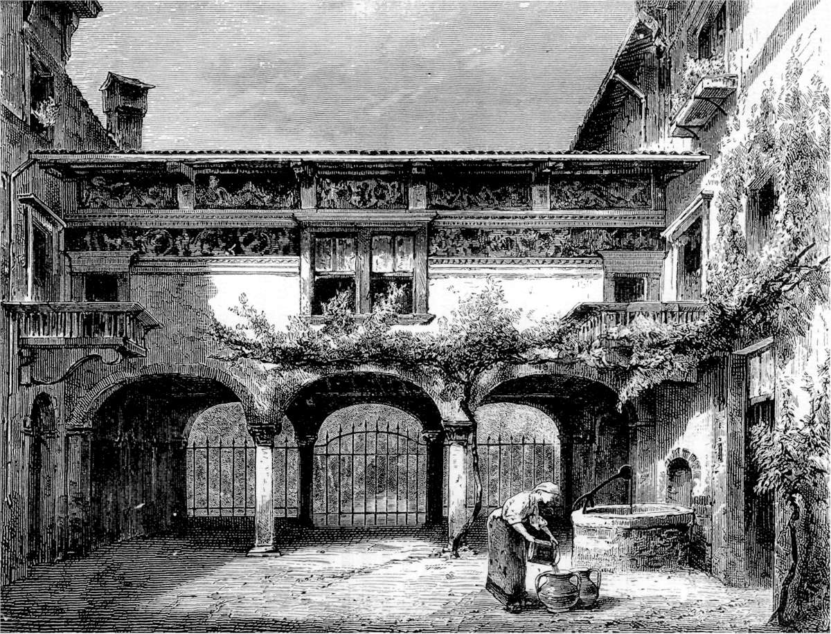 Verona is rich in tombs. From our windows in the Due Torri we looked across to the monument of Guglielmo del Castelbarco, a friend of the Delle Scale, whose massive sarcophagus stands beneath a high Gothic canopy over the gateway of a building which once formed part of the convent of Sta. Anastasia. As we gazed down into the square, with its fountain and groups of old women drawing water, and sometimes setting down their ewers to go and say a short prayer in the beautiful old church of Sta. Anastasia, we used to think that if this outlook were included in the charge for our rooms, we were not paying too much. Another fine monument, by the architect Sanmicheli, to two brothers who rejoiced in the surname of Verità encrusts the front of the church of Sta. Eufemia; and in the cemetery of San Zenone are a tomb and sepulchral urn which claim that they contain the mortal remains of Pepin, king of Italy, the son of Charlemagne. Besides these, altar-tombs, pillared and canopied monuments and mortuary chapels meet the eye everywhere inside and outside of the churches. That which attracts most attention now-a-days is decidedly the least ornamental—the doubly-doubtful tomb of Juliet. It is so acknowledged a lion that the street-boys of the quarter beset you with offers to show you the way. This is no new celebrity: Murray assures us that in the last century, before readers of Shakespeare, native or foreign, were common in Italy, a sarcophagus was regularly exhibited as this sentimental relic. That no longer exists: the present one, which was formerly used as a washing-trough, looks so much like that or a horse-trough of the commonest sort that, even without knowing its claims to be apocryphal, the most credulous sentimental tourist would suspect that it had come up rather than gone down in the world. No matter: we were not dupes, but perhaps the full sweetness and sadness of the story never came home to us with such enfolding charm as on the gray autumn afternoon when we stood beside the pseudo relic in the forlorn little garden of the orphan asylum on the bank of the turbid Adige. The house which is pointed out as Juliet's is less palatial than we expected, though it is a lofty old brick edifice with rounded windows, a stone balcony and a large courtyard: on the keystone of the arched entrance, on the inner side of the court, is the cap (cappello) which gives its name to the street, and is supposed to be the heraldic badge of the family, armoiries parlantes, or punning devices, being a favorite fashion in old times all over Europe. If the balcony which remains was Juliet's, Romeo must have had a long ladder and a cooler head than he showed under other circumstances. There is a stone projection at the window of a lower story which once may have supported a small balcony. The Casa de' Cappelletti is now a livery-stable and inn, the Osteria del Cappello.