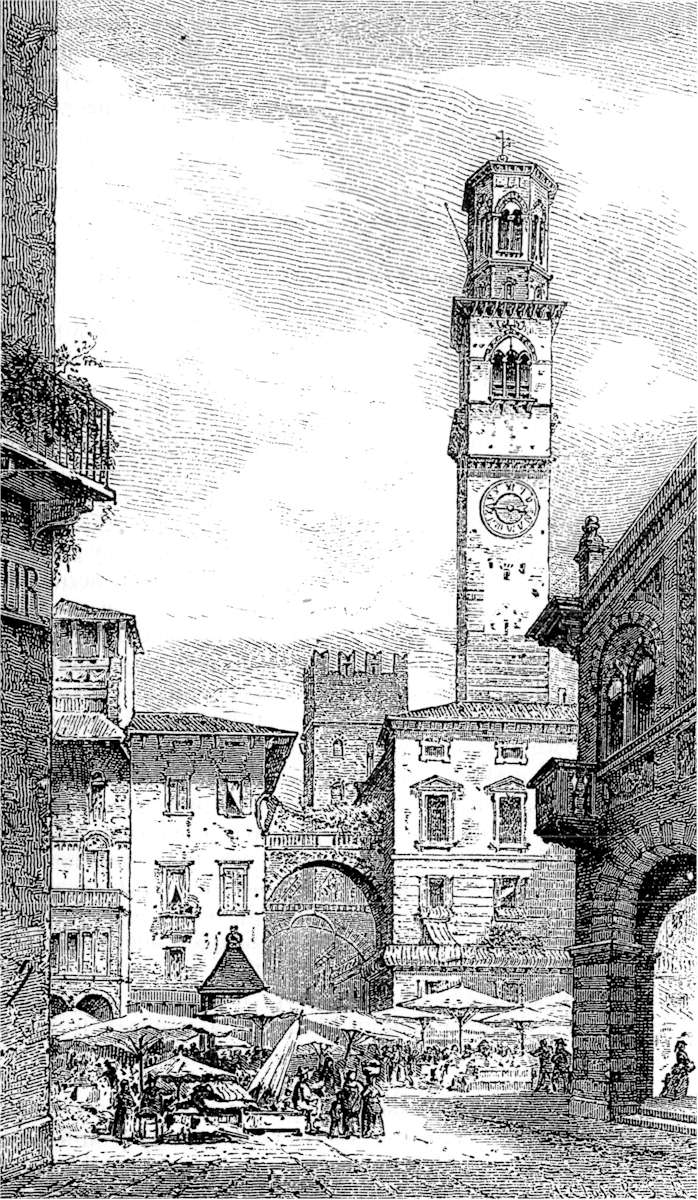 The street leads straight to the Piazza delle Erbe, the vegetable-market (literally, "grass-market"), the forum in ancient[Pg 161] times, the most picturesque spot in all Verona, which seems to collect and concentrate in itself all the reminiscences and characteristics of the town. It communicates on one side with the Piazza dei Signori; and the imposing campanile, or bell-tower, of the latter, a shaft of brickwork nearly three hundred feet high, springing above the intervening palace-roofs, makes a companion to the tall, slender clock-tower at the farther end of the Piazza delle Erbe, one of the many munificent gifts of the Della Scala princes. In the centre of the square is a fountain, originally of great antiquity; near by it the market-cross; close to that[Pg 162] a marble column on which once stood the lion of St. Mark, set up by the Venetians when they seized the city, and thrown down when the republic of Venice fell in 1799. Not far from these two pillars is a sort of stone dais beneath a stone canopy, which was the very focus of the historic and municipal life of the place in mediæval days. Here, when Verona was a free city, the capitano del popolo was inaugurated; proclamations were read from it; criminals heard their sentences pronounced from it. Here people who did not pay their debts were compelled to undergo the grotesque penalty common in the Italian republics for that offence, of sitting for a stated time on the pavement—in puris naturalibus as to the sitting portion of the person: flagstones are to be seen worn to a comfortable concavity by the delinquent convexity.