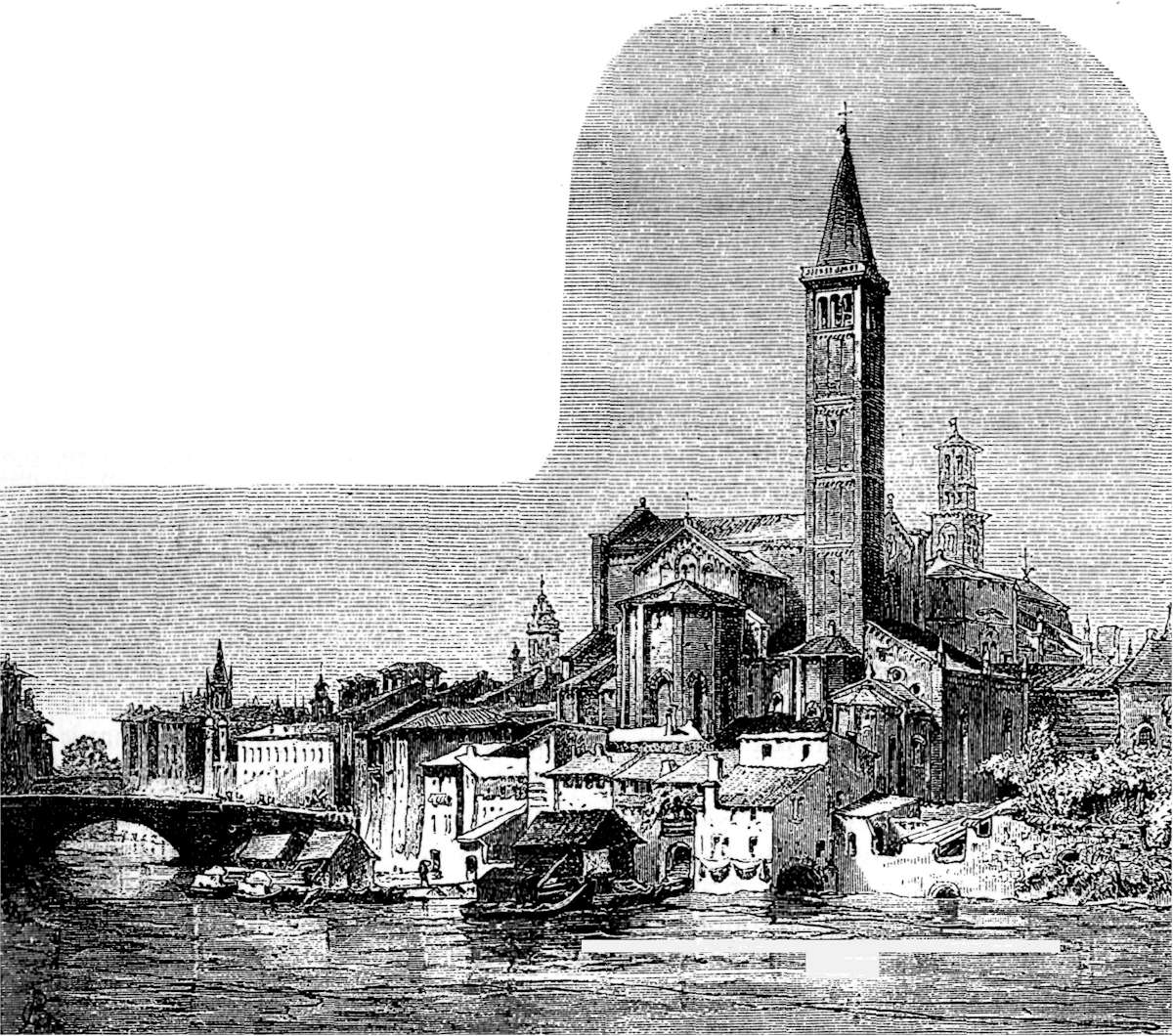 This Romanesque character is what gives the particular stamp to most of the sacred buildings in Verona, making them a study as distinct in their way as the Norman churches at Caen. They belong to one period and one style, although this is a transitional one: the slender pillars of the porches resting on crouching lions, the round-headed arches, the plain, square, soaring campanili, a majestic boldness and simplicity in general effect, an unconscious quaintness in detail, the line of the prevailing red marble contrasting gratefully with the layers of many-toned gray spread by time over the walls, produce a combination of form and color delightful to the eye. The older, original edifice is seldom visible from without: what remains of it is completely built in and over, and is generally to be found in the crypt. Notwithstanding the stateliness and interest of the cathedral, San Zenone was the church to which our steps returned most persistently. It is composed of three churches of very different date, the first having been erected soon after the year 800, the second in 1138, the third three hundred years later. The main building, which is of the twelfth century, is sunk far below the level of the ground: one descends into it from the main portal by ten steps; and this unusual mode of entrance, the depth, the great height, the rigid absence of ornament, the grave colors, the long unbroken lines of the nave, give the interior a remarkable solemnity, and[Pg 164] create an impression and emotion as different as possible from those excited by churches of a later construction, with their florid architecture, their opulence of sculpture and carving, their statues and ornate monuments, their gorgeous paintings, their stained-glass windows—temples