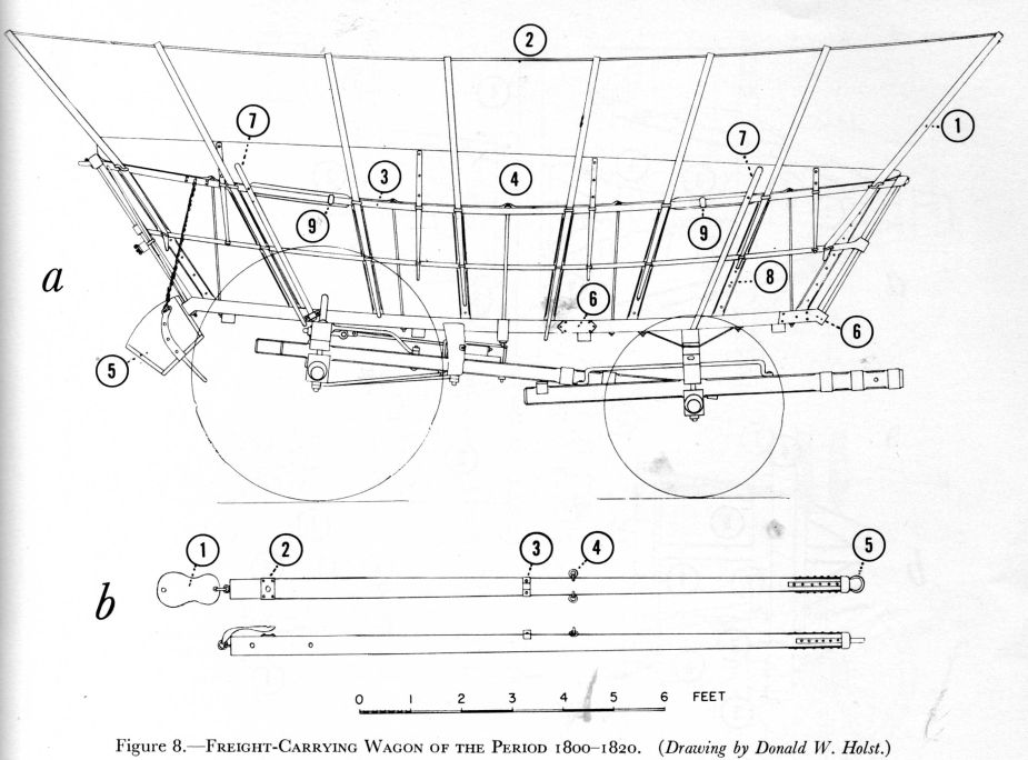 Figure 8.—Freight-Carrying Wagon of the Period 1800-1820. (Drawing by Donald W. Holst.)]