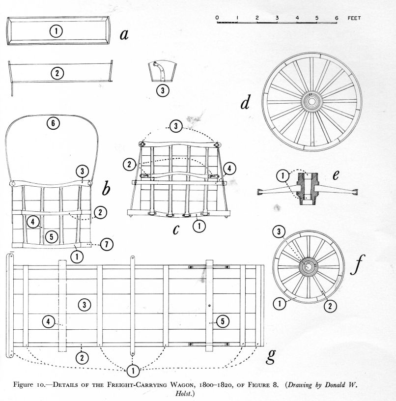 Figure 10.—Details of the Freight-Carrying Wagon, 1800-1820, of Figure 8. (Drawing by Donald W. Holst.)