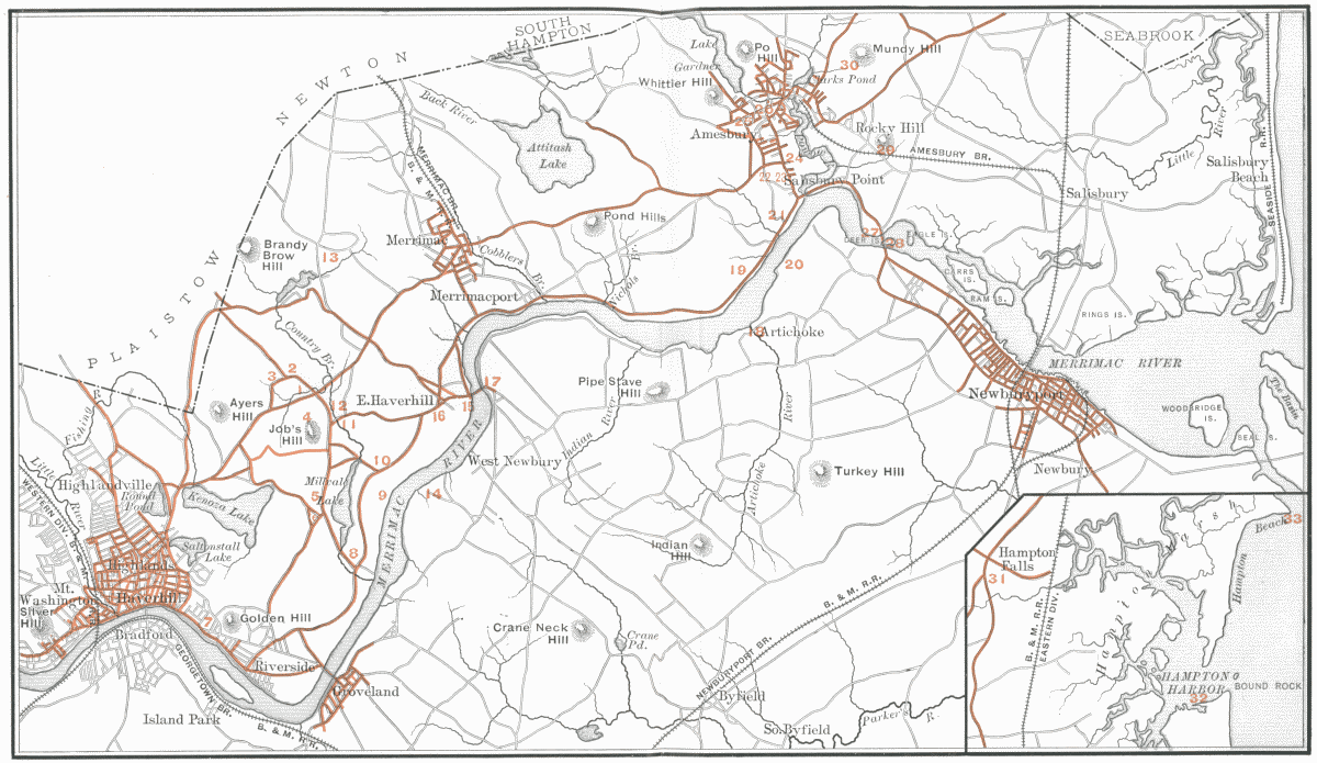 Haverhill, Merrimac, Amesbury, and Salisbury are each on the three-mile-wide ribbon of land stretching to the sea, on the left bank of the river. On the opposite bank are Bradford, Groveland, Newbury, and Newburyport.[Pg 4] The whole region on both sides of the river abounds in beautifully rounded hills formed of glacial deposits of clay and gravel, and they are fertile to their tops. At many points they press close to the river, which has worn its channel down to the sea-level, and feels the influence of the tides beyond Haverhill. This gives picturesque effects at many points. The highest of the hills have summits about three hundred and sixty feet above the surface of the river, and there are many little lakes and ponds nestling in the hollows in every direction. In the early days these hills were crowned with lordly growths of oak and pine, and some of them still retain these adornments. But most of the summits are now open pastures or cultivated fields. The roofs and spires of prosperous cities and villages are seen here and there among their shade trees, and give a human interest to the lovely landscape. It is not surprising that Whittier found inspiration for the beautiful descriptive passages which occur in every poem which has this river for theme or illustration:—
