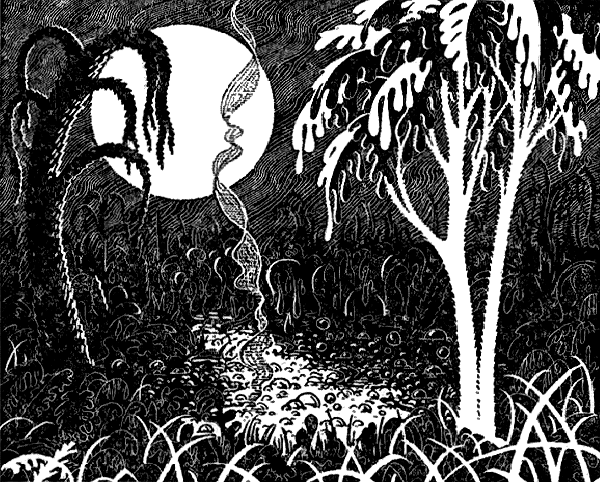 I came to a patch of wilderness, a great marshy plain. In the middle of this swamp was a crater, like those caused by meteors, a deep, ugly scar in the mud. I shuddered at the thought that my darling Mjly might have landed there. Her weaker scientific sense might not have given her the cue to use her skin as a parachute and she might have made the fatal mistake of trying to reverse-levitate.