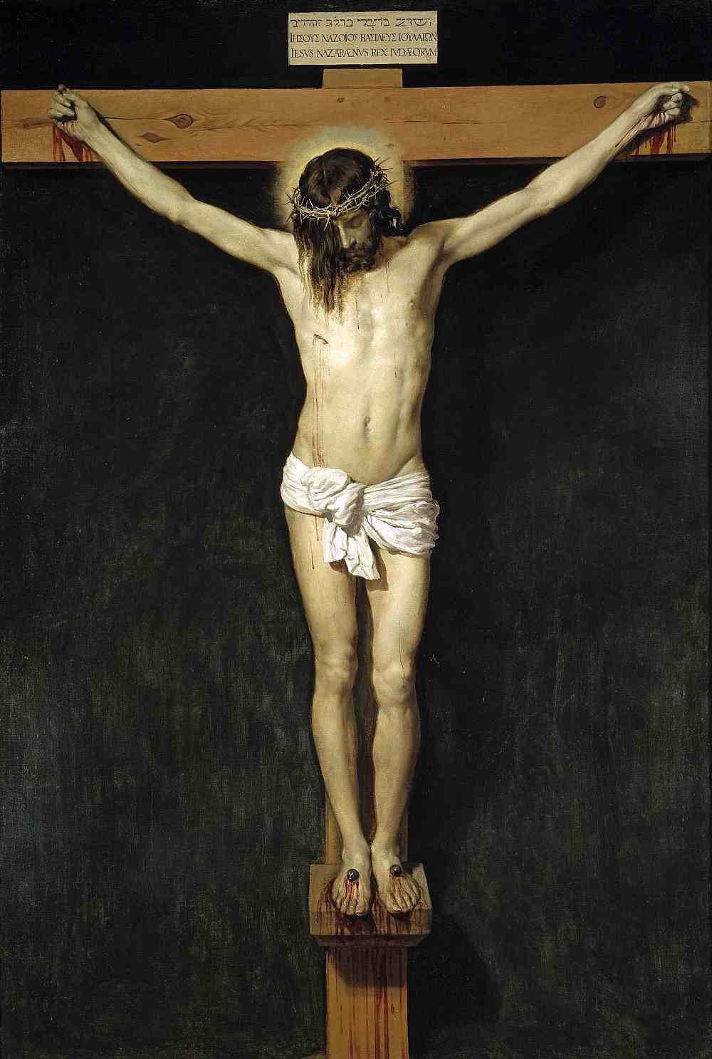 Otra consideración me ha movido a componerlo. En lenguas extrañas se han dedicado a Velázquez obras extensas notabilísimas: en español, trabajos de mérito singular, pero cortos; así, que la opinión extranjera ha circulado más que la nuestra, y como nadie consigue dominar el conocimiento de lo ajeno, y menos en arte, donde sólo se comprenden ciertas cosas habiendo nacido entre ellas, sucede que aun los más ilustres y perspicaces publicistas de otras naciones, han incurrido en ligerezas o errores. Quién dice que el Cristo crucificado del Museo del Prado, es imagen teatral y lúgubre, o que tiene mucha sangre; quién niega que sean de mano de Velázquez las figuras del cuadro de la Vista de Zaragoza; otros le atribuyen lienzos medianos en que no puso pincelada; escritor hay que al hablar de Las Lanzas le supone la ruin malicia de haber pintado zafios a los holandeses y gallardos a los españoles; no falta quien acepte por auténticos cuadros como la pequeña Reunión de retratos del Louvre, y hasta se ha llegado a echar de menos en Velázquez cualidades que poseía en alto grado. Bueno es contribuir a que tales cosas no se crean. Justo es confesar, sin embargo, que la gloria de Velázquez debe más a la crítica extranjera que a la española.
