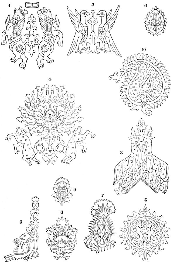 | Raw materials—Revelations of the microscope—Hemp—Jute—Honduras grass—Spartum—Pinna silk—Hair—Leather—Feathers—Asbestos—Coral—Pearls—Beads—Wool—Classical notices of wool—Careful improvement of wool by the ancients—Tanaquil—Homeric woollen carpets—Crimson textile fragments—Scandinavian woollen garments—Qualities of wool—English wool—Goats’ hair—Flax—Lake cities—Byssus—Fine linen of Egypt—The Atrebates—Embroidery on linen—Cotton—Indian origin—Carbasa—Buckram—Cotton fabrics—Gold—Silver—Gold brocades—Jewish—Indian—Chinese—Dress of Darius—Attalus—Attalic textiles—Agrippina’s golden garments—St. Cecilia’s mantle—Roman tombs—Gold wire—Anglo-Saxon tomb—Childeric’s tomb—Proba’s gold thread—Golden wrappings from tombs of Henry I. and Henry III.—Gold embroideries and jewellers’ work of Middle Ages—Spangles—Enamels—Purl—Modern schools of gold embroidery—Silk—Pamphile of Cos—Early specimens of silk stuffs—Chinese silks—The Seres—Mela—Seneca—M. Terrien de la Couperie—Empress Si-ling-chi—Princess of Khotan—Euripides—Lucan—Pliny—Silk in Rome—Ælius Lampridius—Flavius Vopiscus—Tailor’s bill—Justinian’s codex—Imperial monopoly—Paul the Silentiary—Bede—King John’s apparition—Greek and Sicilian manufactories of silk—Distinctive marks of different periods—Lyons—Spain—Italy—Flemish towns—Marco Polo—Satin—Welsh poem, “Lady of the Fountain”—Chaucer—Velvet—Transference of work to new materials | 118 | |