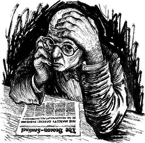 No newspapers! Just like that! He waves an edict, and just like that, no newspapers! The Beacon-Sentinel has been a great paper for the last twenty-five years! It was nothing, and I was nothing, and together we became a Voice! And now again, we are nothing!