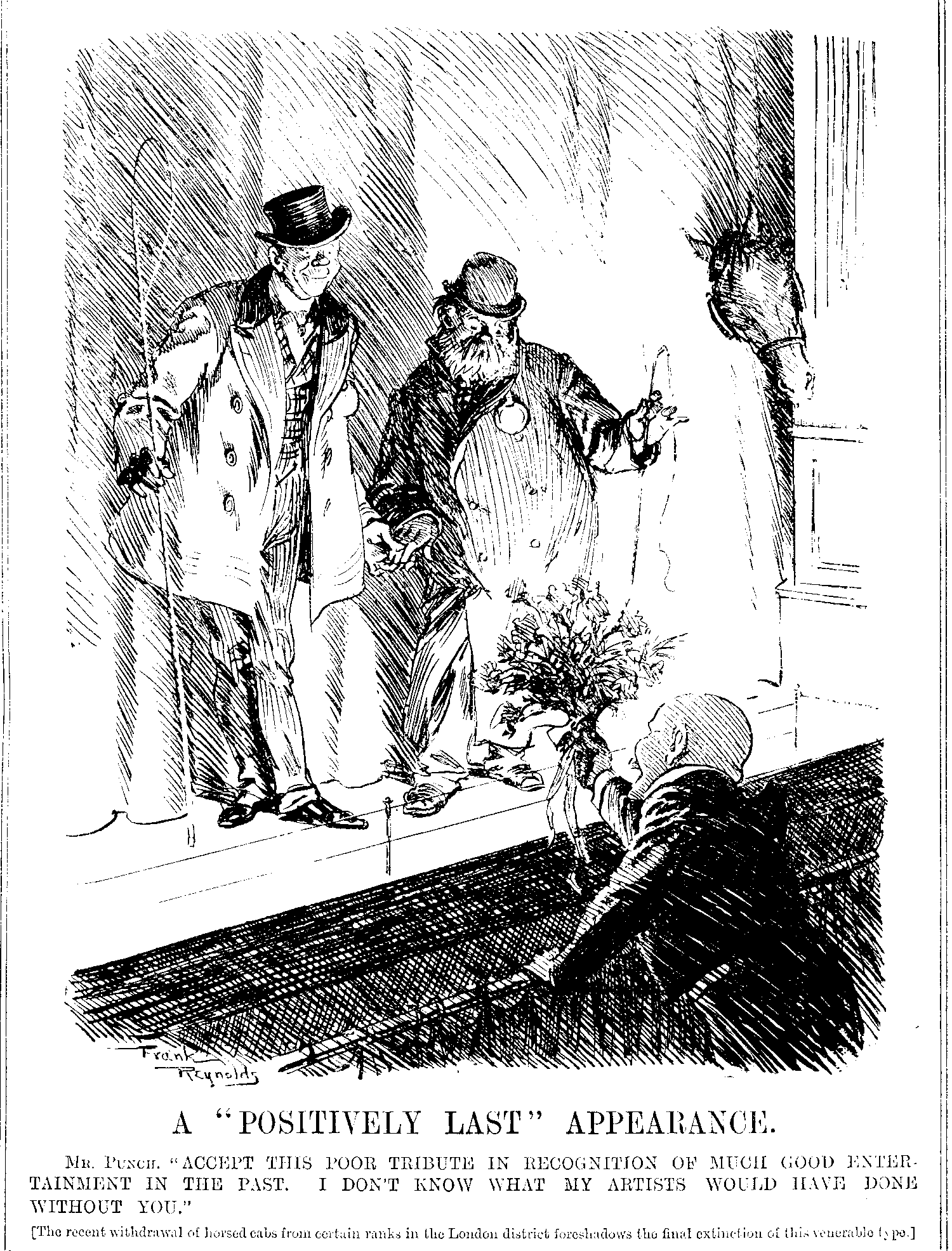 [The recent withdrawal of horsed cabs from certain ranks in the London district foreshadows the final extinction of this venerable type.]