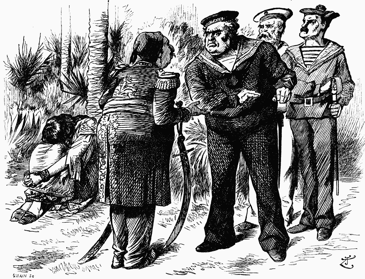 John Bull. "Look here,—we've had enough of your palaver! are you going to let the girl go, or have we got to make you?"
