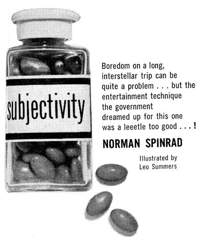 The Project Gutenberg EBook of Subjectivity, by Norman Spinrad This eBook is for the use of anyone anywhere at no cost and with almost no restrictions whatsoever. You may copy it, give it away or re-use it under the terms of the Project Gutenberg License included with this eBook or online at www.gutenberg.org Title: Subjectivity Author: Norman Spinrad Illustrator: Leo Summers Release Date: December 21, 2009 [EBook #30722] Language: English Character set encoding: ISO-8859-1 *** START OF THIS PROJECT GUTENBERG EBOOK SUBJECTIVITY *** Produced by Sankar Viswanathan, Greg Weeks, and the Online Distributed Proofreading Team at http://www.pgdp.net
