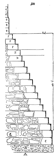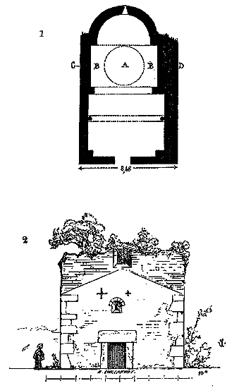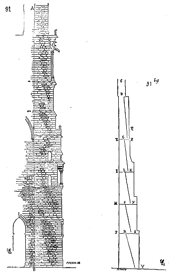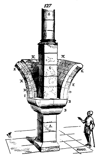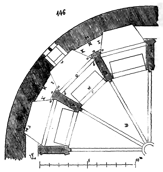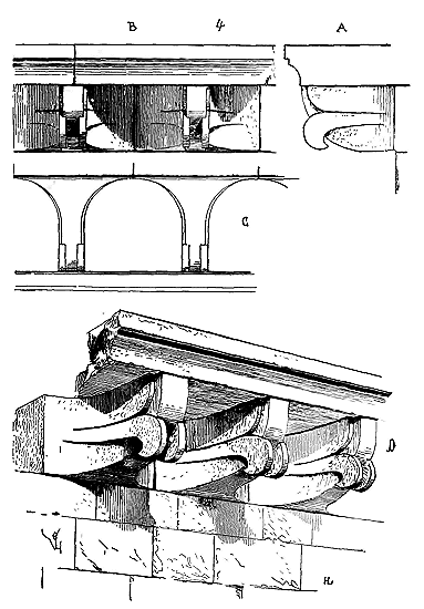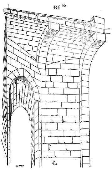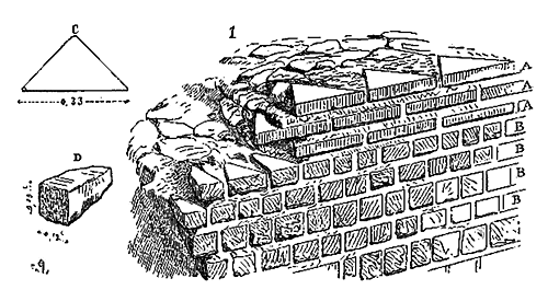 Nous indiquons en A les assises de briques triangulaires présentant leur grand côté sur le parement, et en B les assises de moellons à peu près réguliers et présentant leurs faces, le plus souvent carrées, sur les parements. En C est figurée une brique dont l'épaisseur varie de 0,04 c. à 0,05 c., et en D un moellon de parement. Ce n'était qu'une construction romaine grossièrement exécutée. Mais les Romains n'employaient guère cette méthode que lorsqu'ils voulaient revêtir les parements de placages de marbre ou de stuc; s'ils faisaient des parements de pierre de taille, ils posaient celles-ci à joints vifs, sans mortier, sur leurs lits de carrière, et leur laissaient une large assiette, pour que ces parements devinssent réellement un renfort capable de résister à une pression que les massifs seuls n'eussent pu porter.
