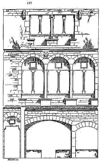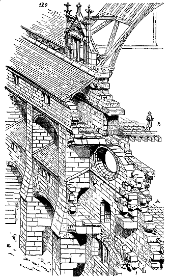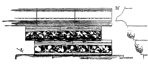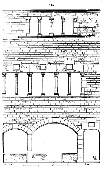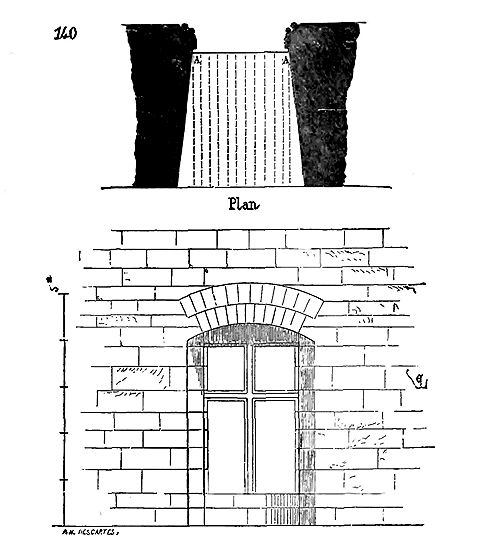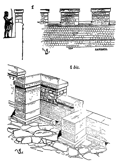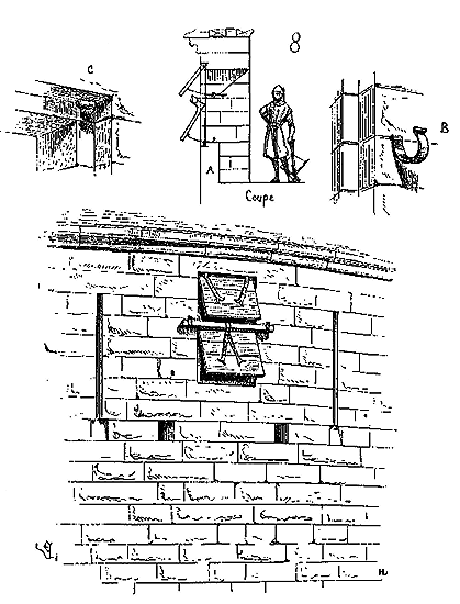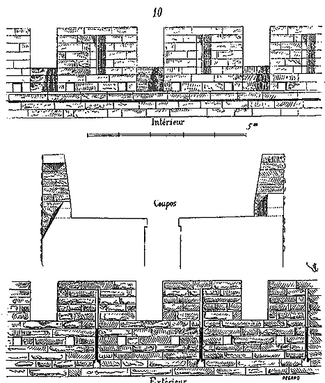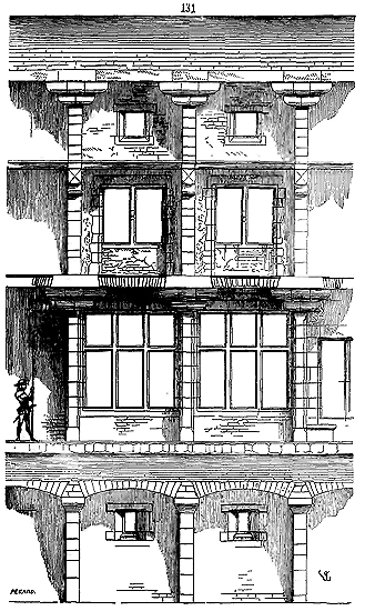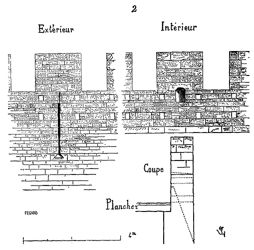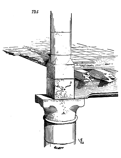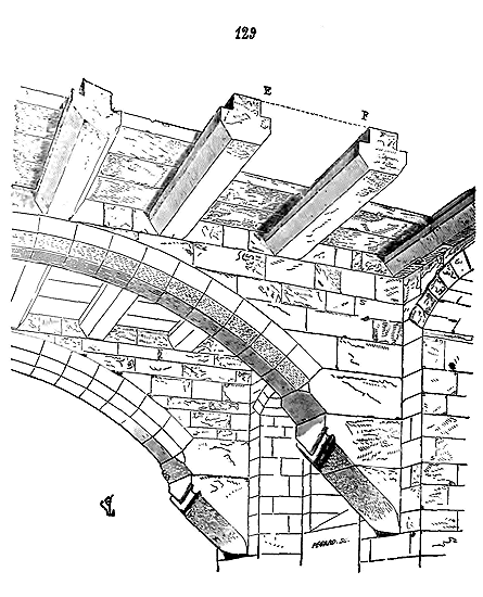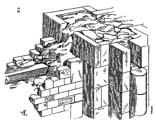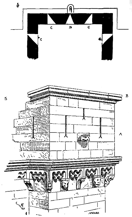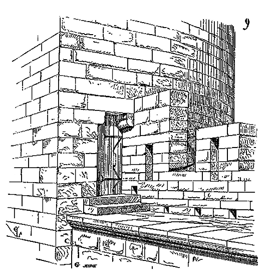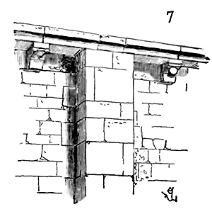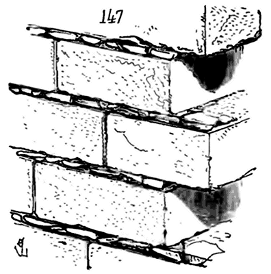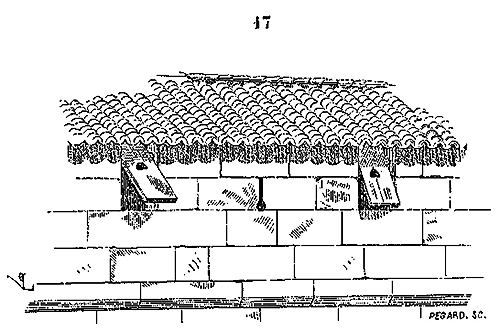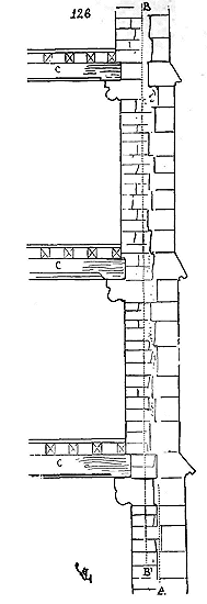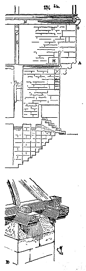 Notre fig. 2 donne une idée de ce genre de construction. Afin de relier les diverses parties des bâtisses, de chaîner les murs dans leur longueur, ils noyèrent dans les massifs, à différentes hauteurs, sous les appuis des fenêtres, au-dessous des corniches, des pièces de bois longitudinales, ainsi que nous l'avons figuré en A (voy. CHAÎNAGE). Dans ces constructions, la pierre est économisée autant que faire se peut; aucun morceau ne présente d'évidements: tous sont posés en besace; ce n'est qu'un revêtement exécuté d'ailleurs avec le plus grand soin; non-seulement les parements sont layés, mais aussi les lits et les joints, et ces pierres sont posées à cru sans mortier, comme l'appareil romain.
